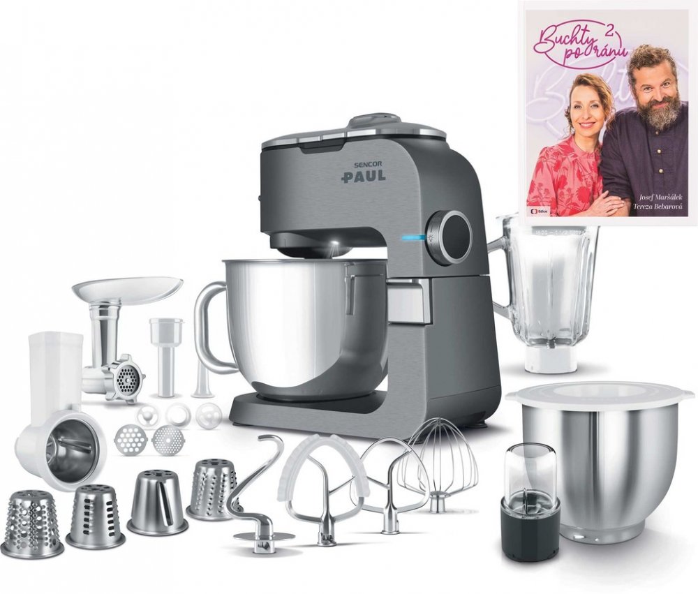 Kuchyňský robot - multifunkční, celokovový, planetární hnětení, příkon 1700 W, kovové vnitřní převody, nerezový plášť, materiál mísy nerez, objem mísy 6,5 l, 6 rychlostí, plynulá regulace otáček, tlačítko PULSE, s výkyvným ramenem, včetně stabilizátoru otáček, funkce šlehání, mísení, hnětení, osvětlení, mletí a mixování, součástí nástavec na plnění uzenářských produktů, mlýnek na maso, bubínkové struhadlo, tvořítko na cukroví, šlehací metla (balónová metla), hnětací hák, k metla, míchací metla (stěrková metla), mísa, mixovací nádoba, víko, tvořítko na cukroví a skleněný mixér, hlučnost 85 dB, šedá barva