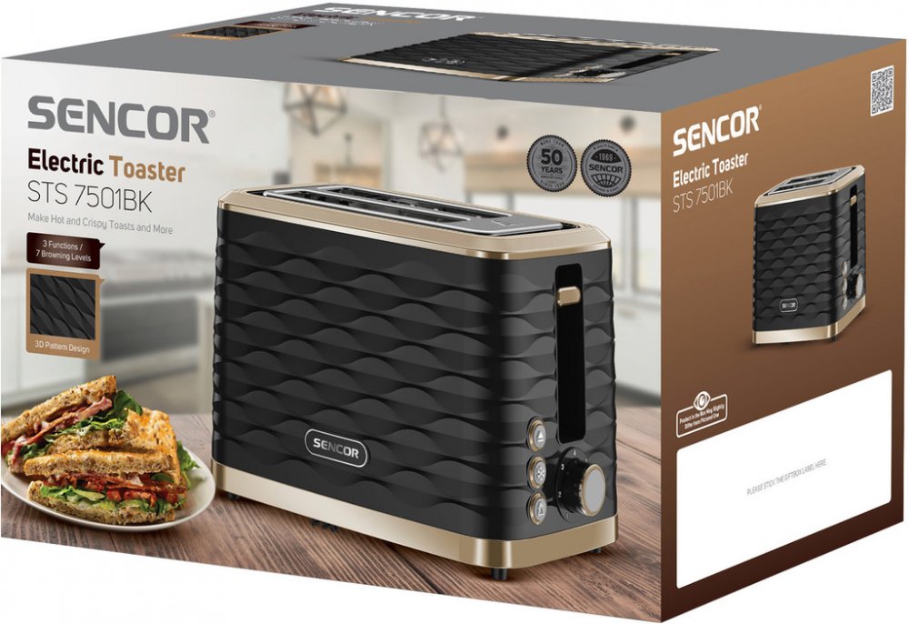 Pripravte si vynikajici tousty, nejen na snidani, s elektrickym topinkovacem Sencor STS 7501BK. Je to elegantni pristroj, ktery vam dopreje ty nejchutnejsi topinky. Hodi se do kazde moderni kuchyne a nabizi opeceni az2 topinek soucasne s moznosti volby intenzity propeceni. Samozrejmosti jsou funkce jako automaticke centrovani peciva, okamzite preruseni provozu i moznost pecivo rozmrazit. Nabizi 7 intenzit peceni a automaticky vysun peciva s ukoncenim programu.