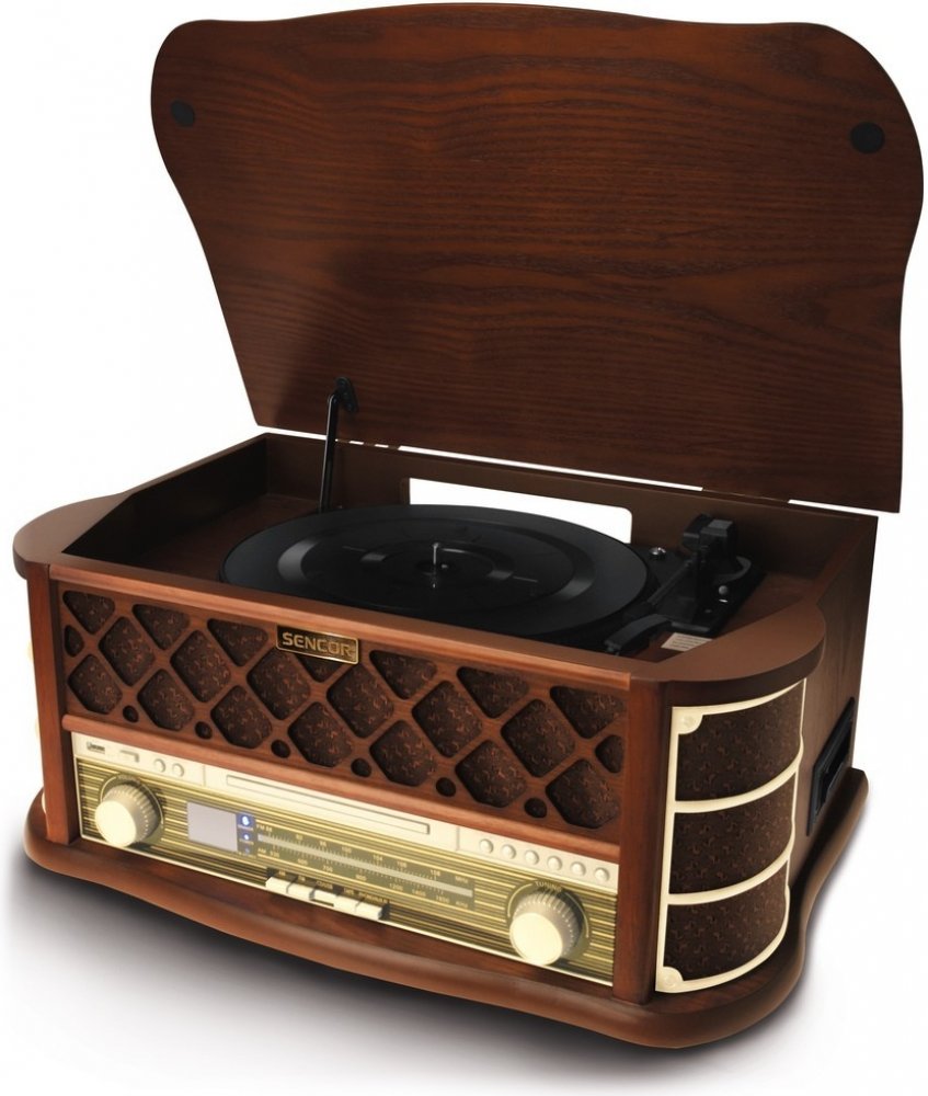 Gramofon pro přehrávání vašich oblíbených desek je ukrytý pod odklopným dřevěným víkem. Má automatické spouštění jehly a funkci autostop - po skončení poslední skladby na vinylu se raménko s jehlou přemístí do klidové polohy a otáčení desky se zastaví bez jejího poškrábání. Vedle klasických kompaktních disků Sencor STT 016 umožňuje i přehrání CD-R (RW) se soubory MP3 a WMA.