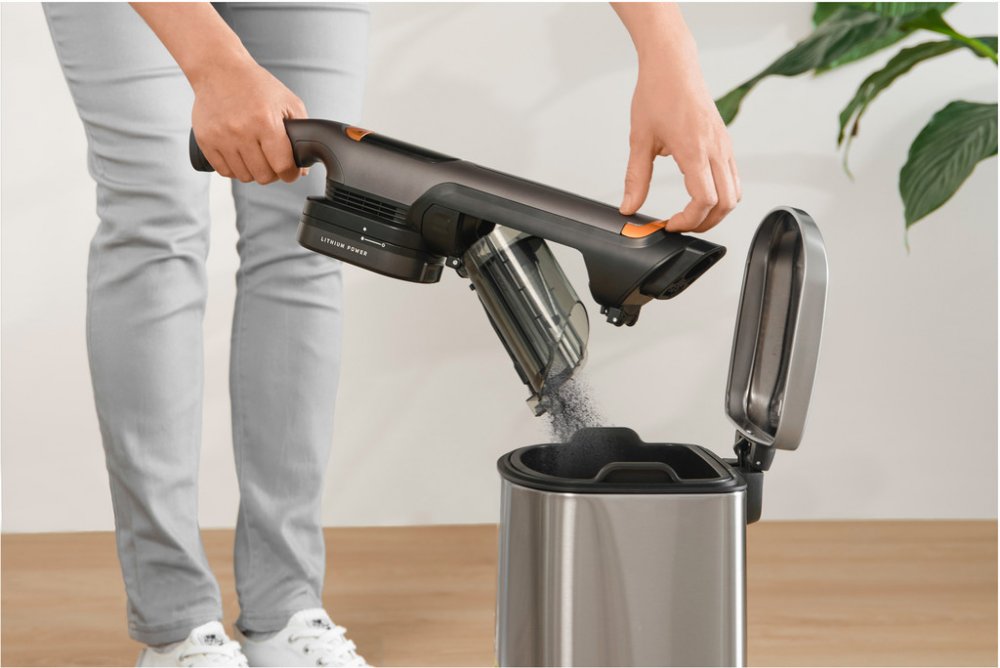 Při vysávání oceníte tichý chod vysavače, který vydává hluk pouhých 86 dB. Pro zachycení nečistot slouží průhledná nádoba na prach o objemu 0,2 l, kterou snadno vysypete do koše. Údržba vysavače je velmi snadná - stačí jej otřít vlhkým hadříkem nebo houbičkou. Kompaktní rozměry a nízká hmotnost 1,9 kg zajišťují skvělou ovladatelnost.