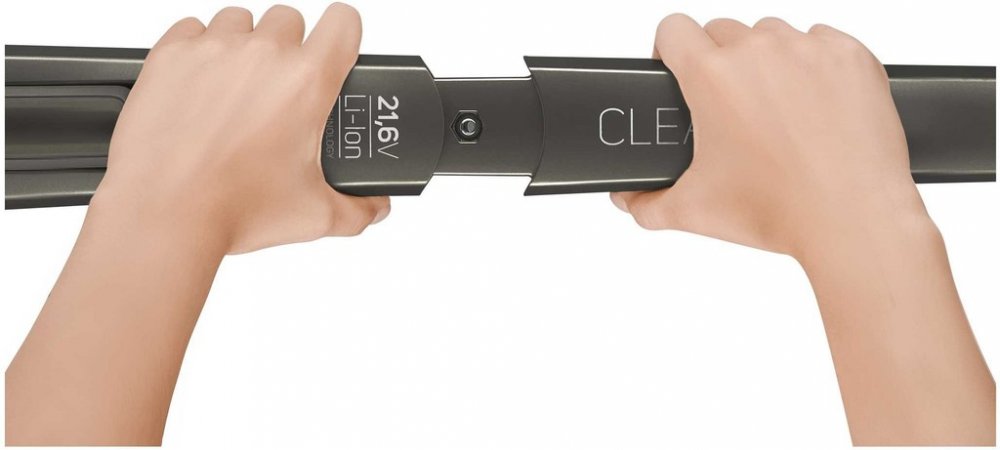 Integrovaná Li-Ion baterie 21,6 V zajistí až 50 minut provozu na jedno nabití. Nabíjení probíhá v praktické základně a trvá přibližně 4–6 hodin. Bez napájecího kabelu se snadno dostanete do všech koutů a vysavač díky funkci samostatného stání pohodlně odstavíte kdykoli během úklidu.