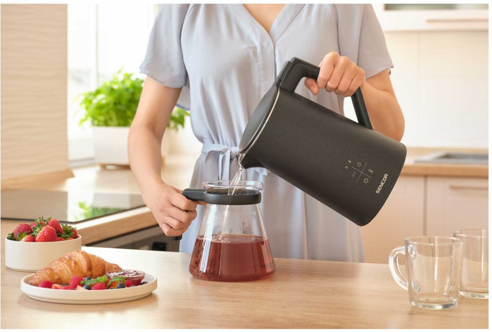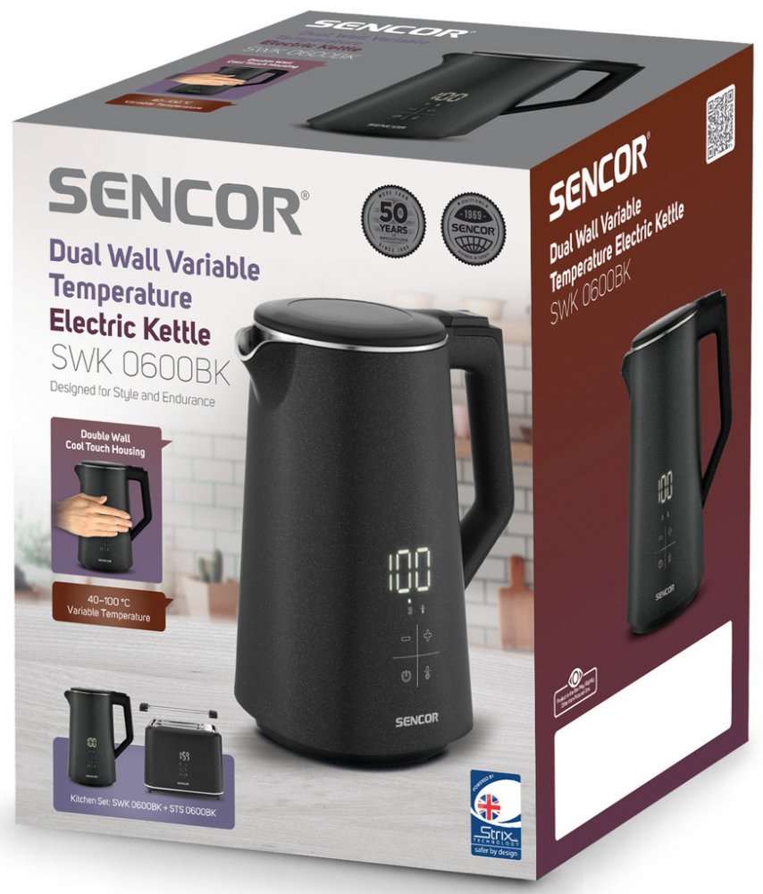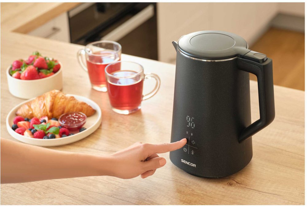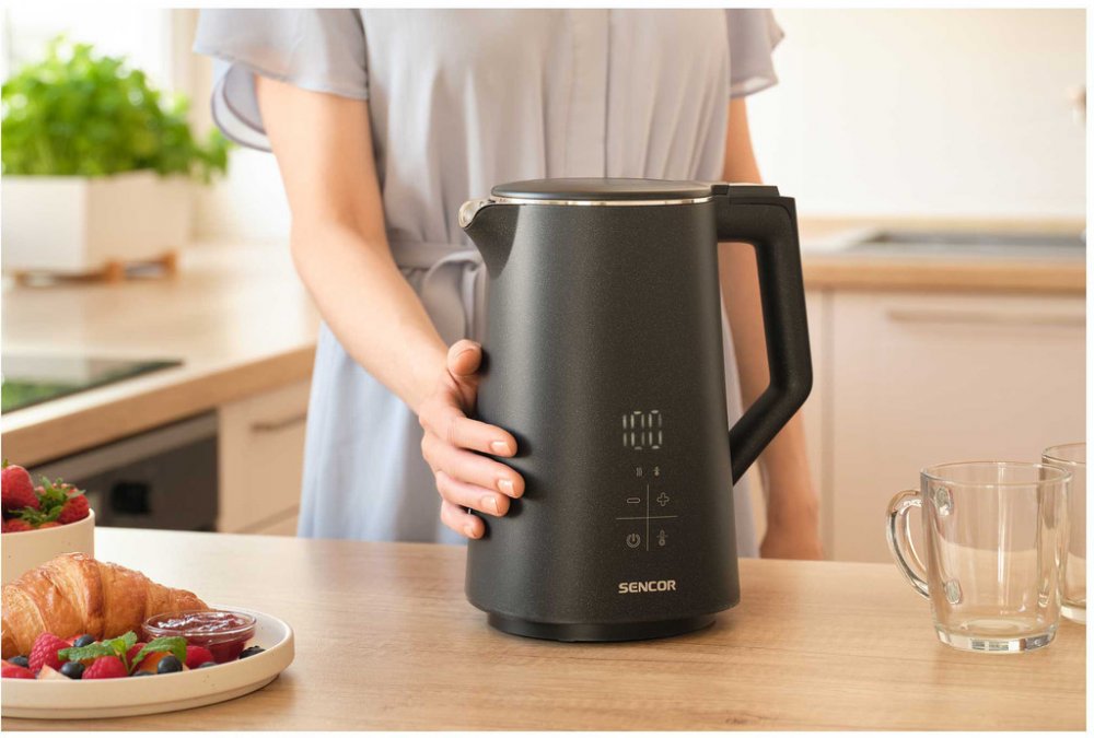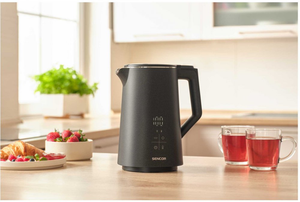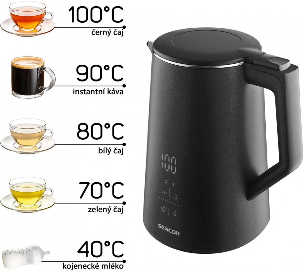 SENCOR SWK 0600BK rychlovarná konvice nabízí výkon 2200 W, variabilní nastavení teploty od 40 do 100 °C a funkci Keep Warm na udržení teploty až 2 hodiny. Bezpečný dvoustěnný design a snadná údržba díky vyjímatelnému filtru.