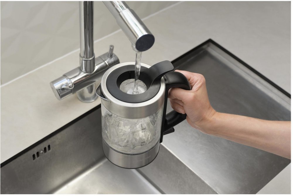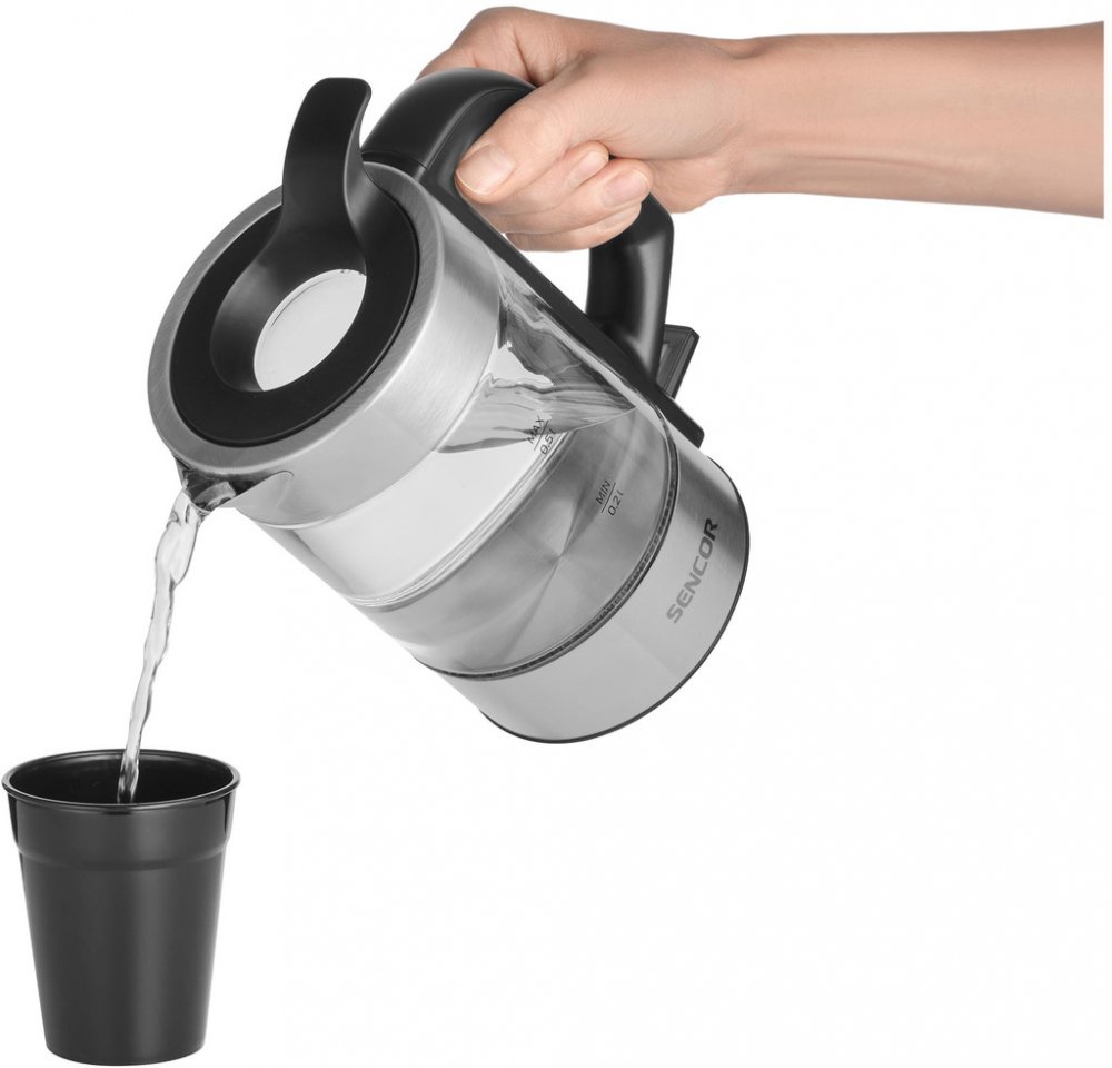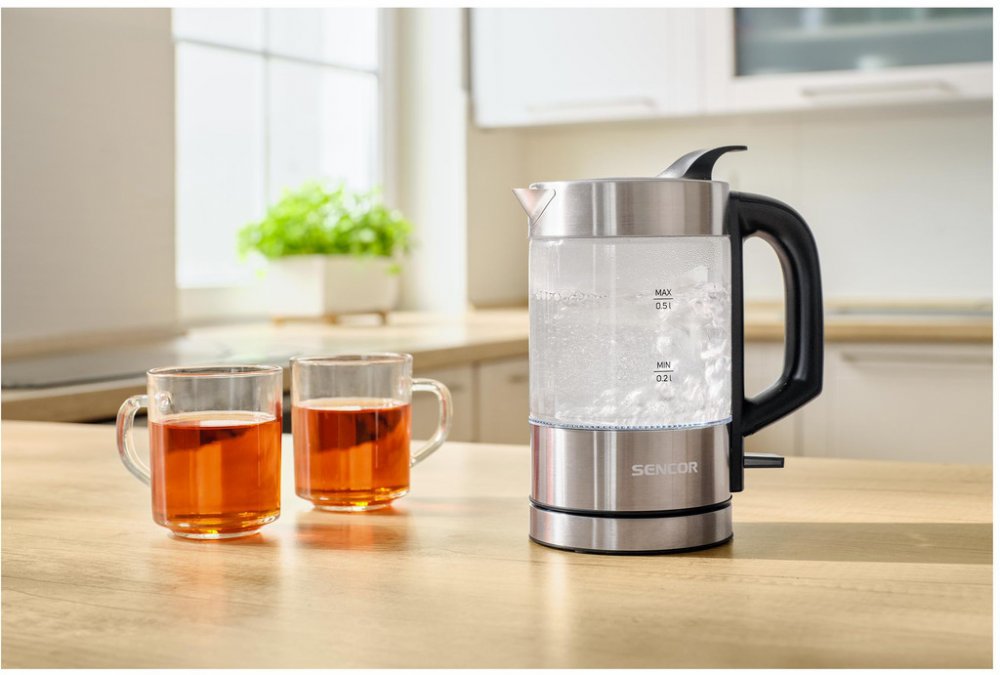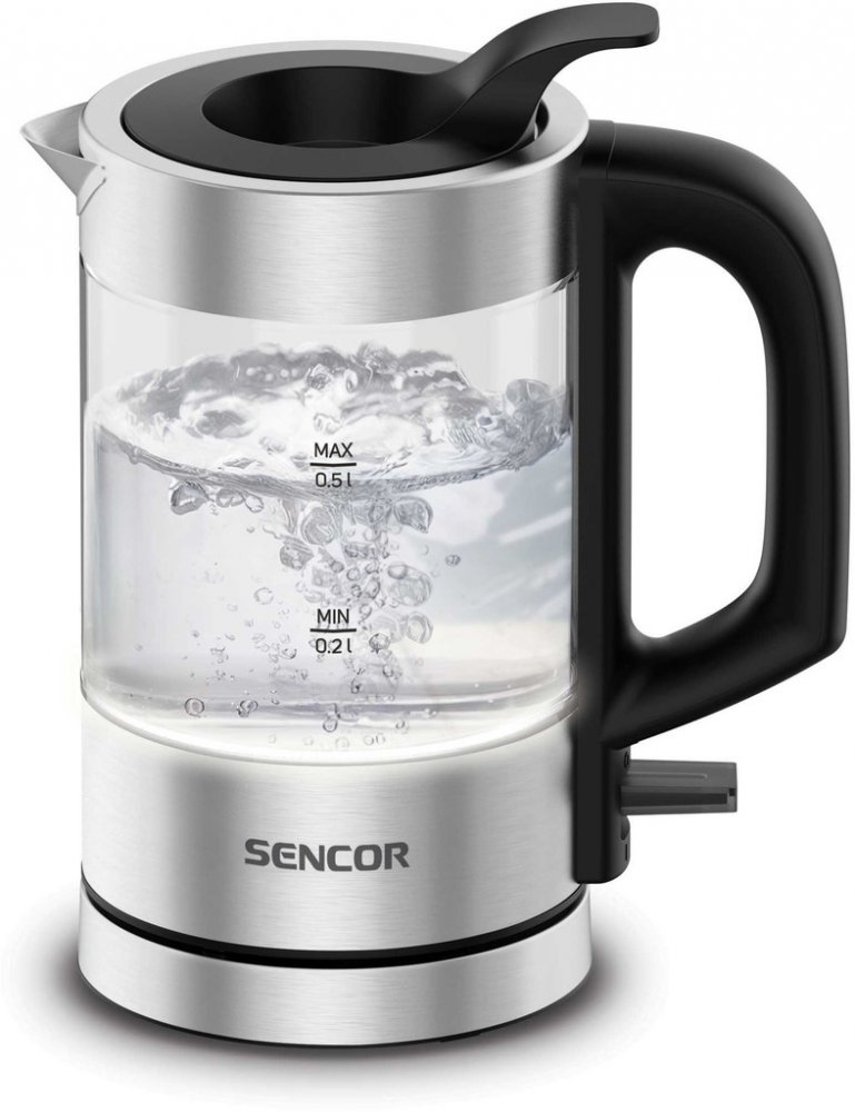 Malá a kompaktní rychlovarná konvice, Sencor SWK 160SS je ideální na cesty nebo pro úsporu místa v malé kuchyni. Kapacita konvice je 0.5 l vody a je vyrobena z nerezové oceli a kvalitního borosilikátového skla odolného proti změnám teplot. Skryté topné těleso s výkonem 1100 W zajistí rychlou přípravu horké vody. Plnění vodou jde snadno přes praktické víko, které není potřeba otvírat nebo sundávat dolů. Konvice je vybavena otočnou základnou se středovým konektorem pro uložení konvice z 360°. Bezpečnost hlídají pojistky proti vyvaření, přehřátí a je vybavena automatickým vypnutím po dosažení varu. Čistou vodu zajistí vyjímatelný filtr proti nečistotám a vodnímu kameni. Úložný prostor pro přívodný kabel se nachází pod základnou. V balení se taky nachází dva plastové šálky a lžičky z materiálu, který neobsahuje BPA.