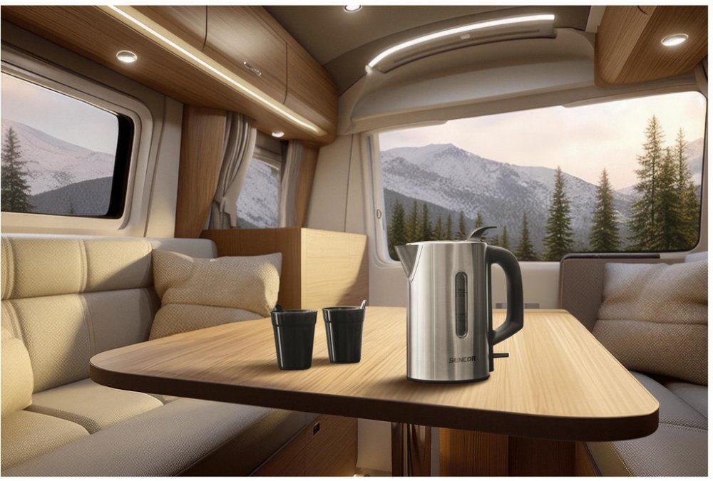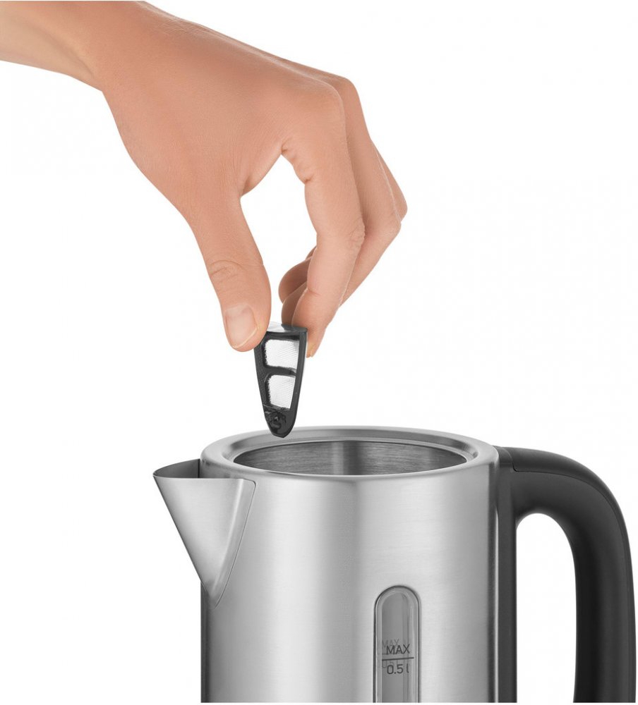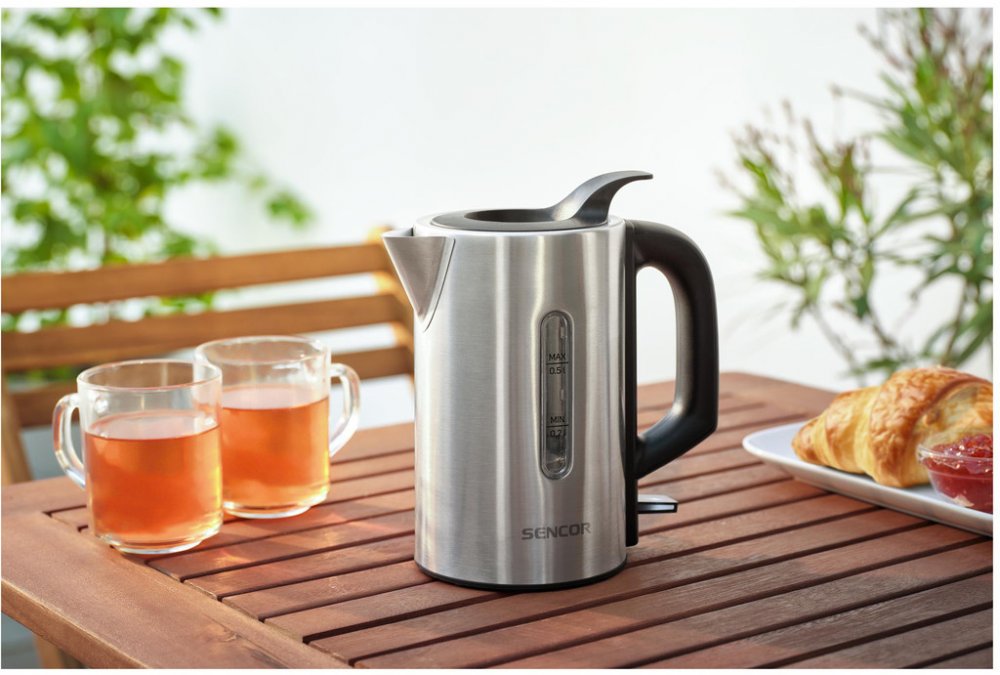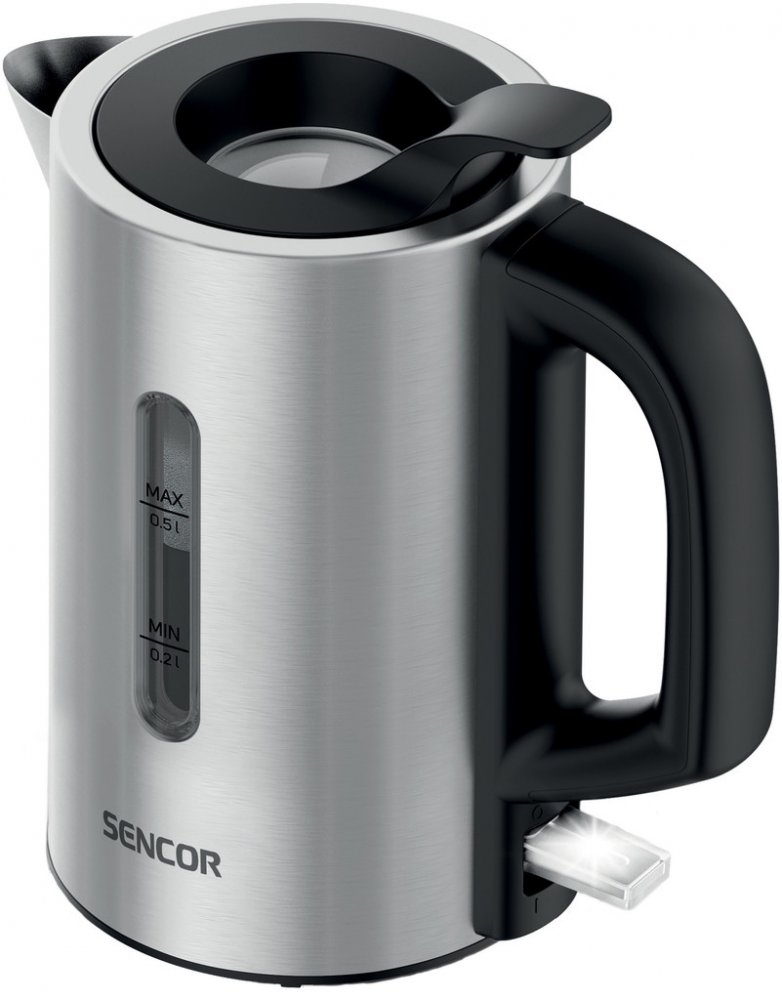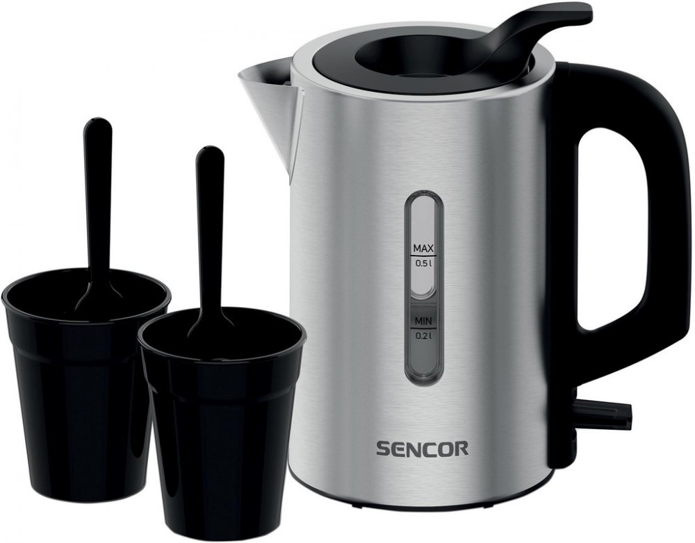 Malá a kompaktní konvice Sencor SWK 170SS je ideální na cesty, do karavanu, na jachtu nebo jen pro úsporu místa v malé kuchyni. Konvice má objem 0,5 litru vody a je vyrobena z vysoce kvalitní nerezové oceli. Skryté topné těleso o příkonu 1100 W zajišťuje rychlou přípravu horké vody. Plnění vodou je snadné díky praktickému víku, které není třeba otevírat ani sundávat. Hladinu vody můžete kontrolovat průhledným okénkem na boku konvice. Bezpečnost hlídá pojistka proti převaření a přehřátí a je vybavena automatickým vypnutím při dosažení bodu varu. Čistotu vody zajišťuje vyjímatelný filtr proti nečistotám a vodnímu kameni. Pod spodkem konvice je umístěn úložný prostor pro přívodní kabel. Součástí balení jsou také dva plastové šálky a lžičky vyrobené z materiálu bez obsahu BPA.