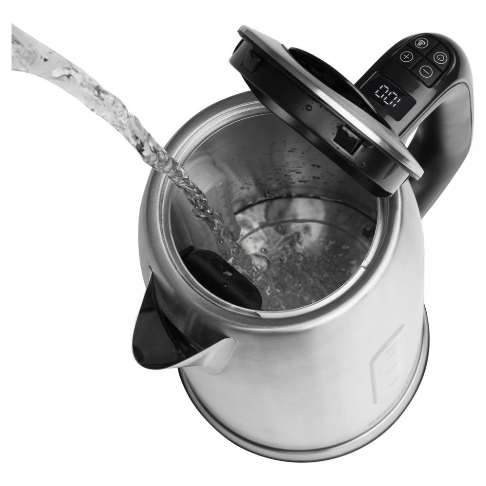 nerezová rychlovarná konvice v elegantním designu • objem: 1,7 litru • max. příkon: 2 400 W • 11 nastavitelných teplot vody • ideální pro čajové vyznavače • funkce udržování teploty po dobu 240 min • světelná indikace - vhodné i pro osoby s poruchami sluchu • automatické vypínání i v případě dosažení bodu varu • omyvatelný filtr • 4 tlačítka v rukojeti • hmotnost: 930 g (bez podstavce)