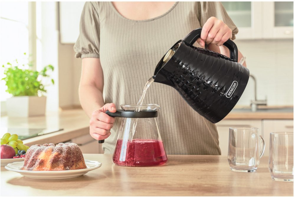 Pro vasi ranni kavu, bylinky nebo cajVychutnejte si skvelou kavu, hrejivy caj nebo vonave bylinky s elegantni rychlovarnou konvici SWK 7501BK. Diky premiovemu cernemu designu s jemnym vzorkem prirozene doplni interier kuchyne. Pokud vas bavi stylovy design, muzete konvici doplnit toasterem STS 7501BK ze stejne rodiny. Vnitrni prostor o objemu 1,7 l naplnite vodou s vyuzitim pruhledu, ktery ma oboustranny vodoznak. Zapnete ohrev vody, o ktery se postara topna spirala o vykonu 2 200 W. Pote se konvice automaticky vypne.