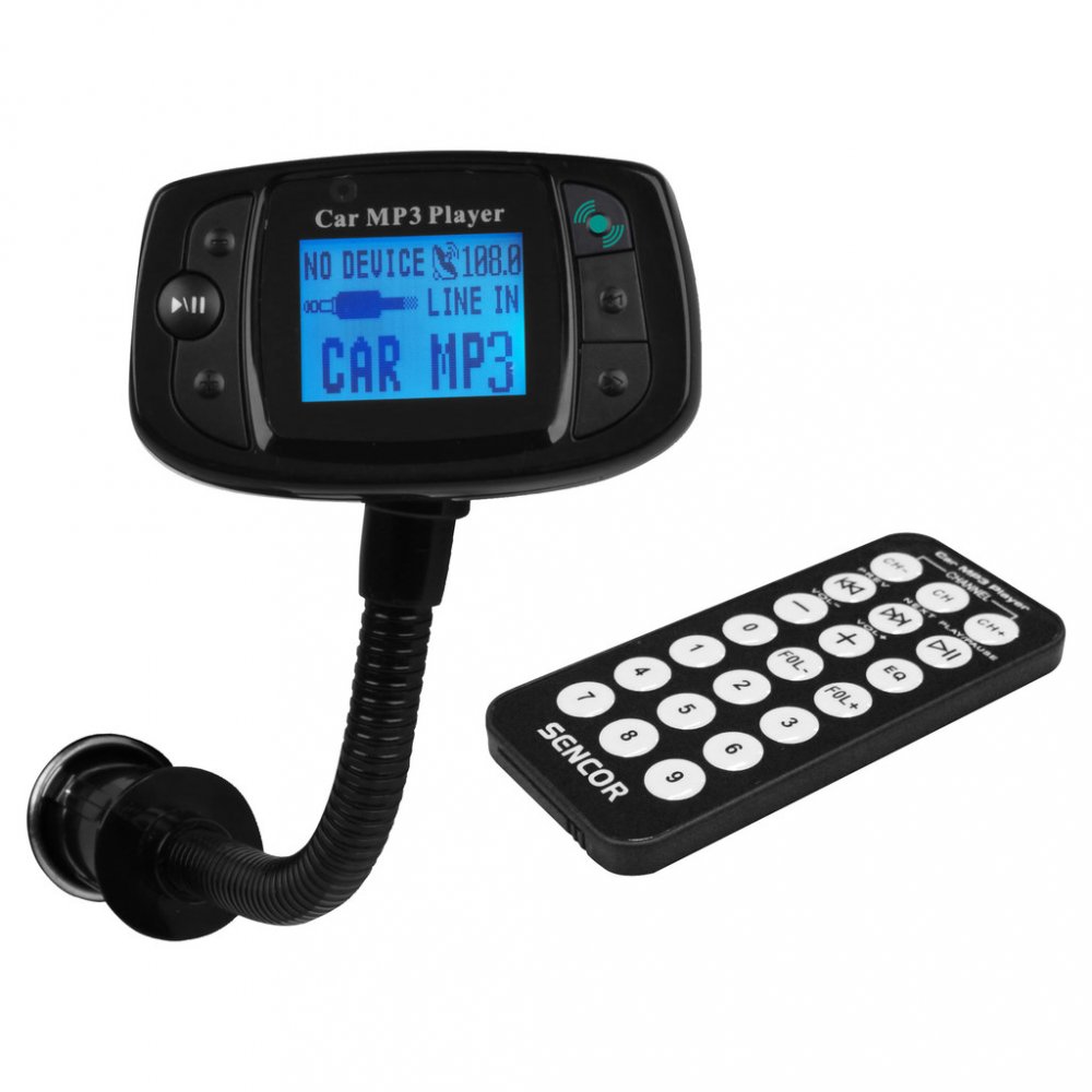 FM transmitter Sencor SWM 181 s 3,5 cm podsvíceným LCD displejem. Dálkové ovládání, zobrazení názvů souboru a skladby, podpora přijetí hovoru z chytrých telefonů.