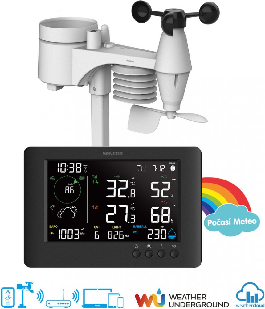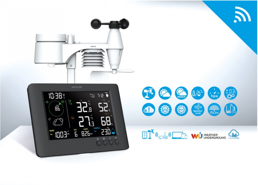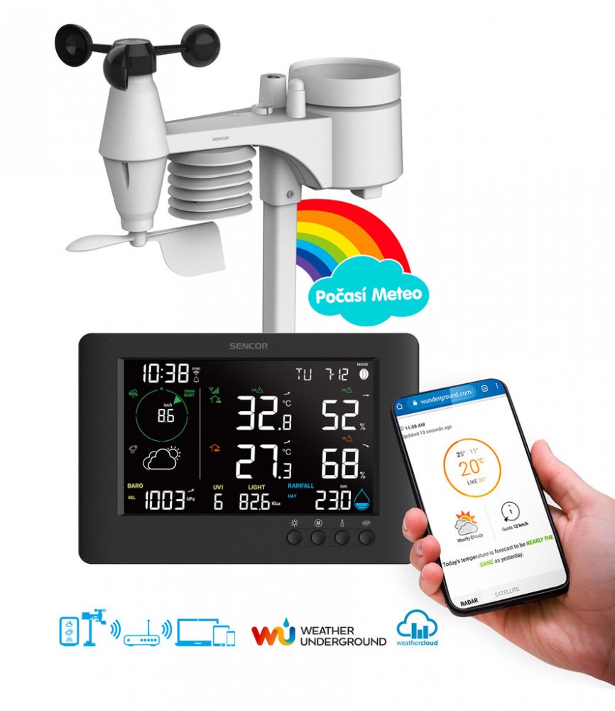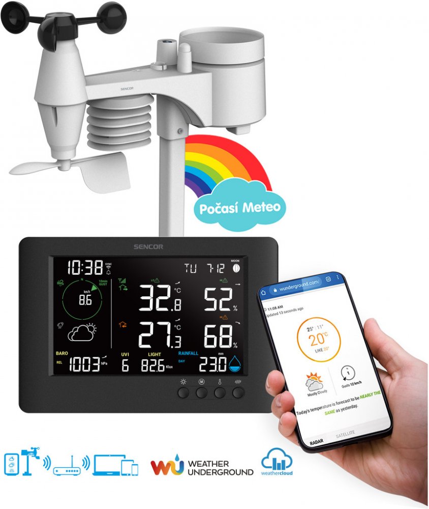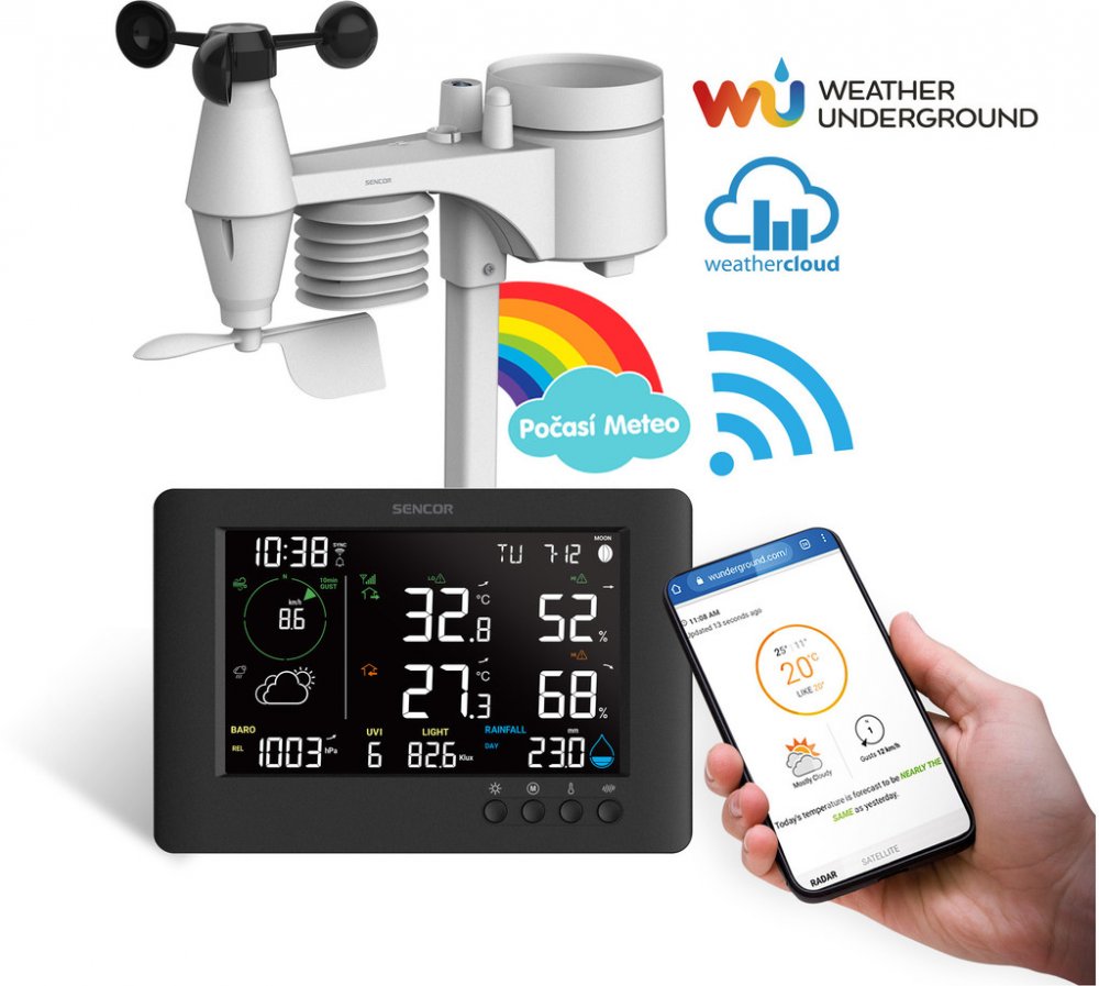 Profesionální meteorologická stanice SENCOR SWS 10500 Wi-Fi je ideální volbou pro každého, kdo chce mít přehled o počasí s profesionální přesností. Přiložený bezdrátový senzor 7v1 je vybaven švýcarskými čidly SENSIRION a měří teplotu, barometrický tlak, vlhkost, rychlost a směr větru, intenzitu srážek, UV index, a dokonce i intenzitu světla. Díky Wi-Fi připojení se data automaticky odesílají na platformy Weather Underground a Weathercloud. Můžete tak naměřené hodnoty sledovat odkudkoli prostřednictvím vašich chytrých zařízení včetně telefonu, tabletu nebo počítače. Podporovány jsou mobilní platformy iOS i Android.