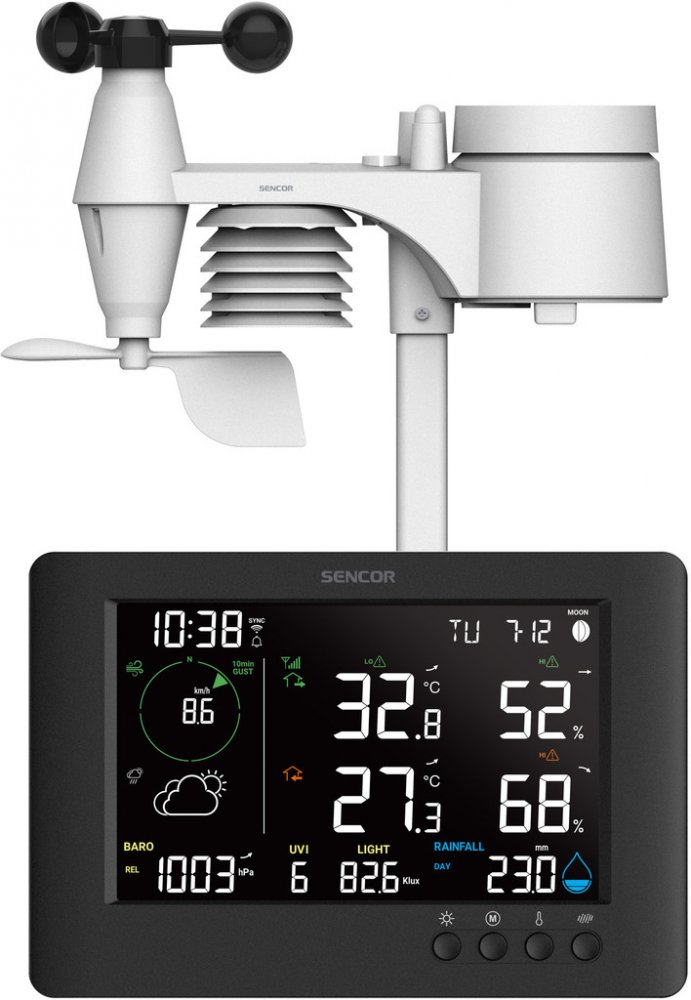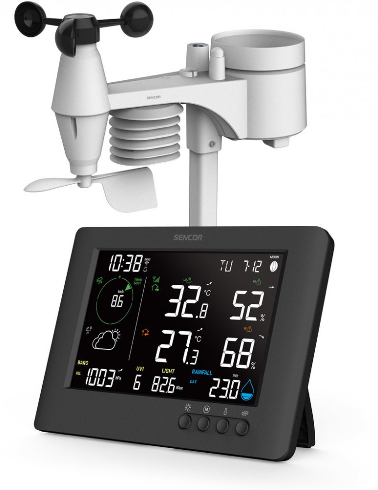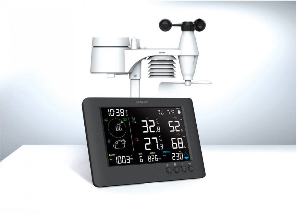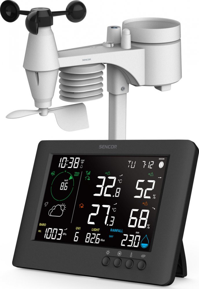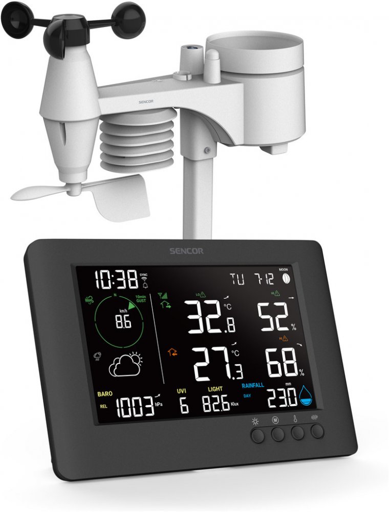 Profesionální meteorologická stanice SENCOR SWS 10500 Wi-Fi je ideální volbou pro každého, kdo chce mít přehled o počasí s profesionální přesností. Přiložený bezdrátový senzor 7v1 je vybaven švýcarskými čidly SENSIRION a měří teplotu, barometrický tlak, vlhkost, rychlost a směr větru, intenzitu srážek, UV index, a dokonce i intenzitu světla. Díky Wi-Fi připojení se data automaticky odesílají na platformy Weather Underground a Weathercloud. Můžete tak naměřené hodnoty sledovat odkudkoli prostřednictvím vašich chytrých zařízení včetně telefonu, tabletu nebo počítače. Podporovány jsou mobilní platformy iOS i Android.