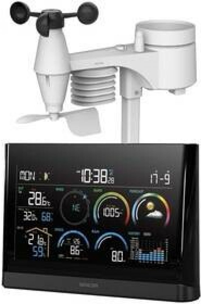 Barevný displej TRUE BLACK s automatickým jasem, Bezdrátový snímač 5v1 s dosahem až 150 m a švýcarskými čidly SENSIRION, Měření teploty, tlaku, vlhkosti, dešťových srážek, rychlosti, směru větru a intenzity světla, UV index, Beaufortova stupnice, pocitová teplota, rosný bod