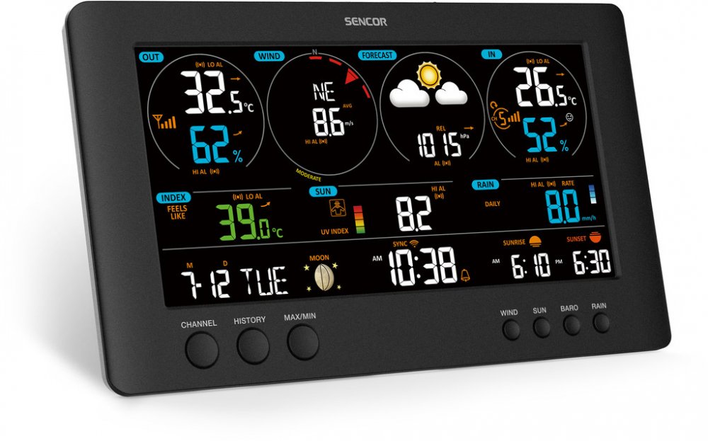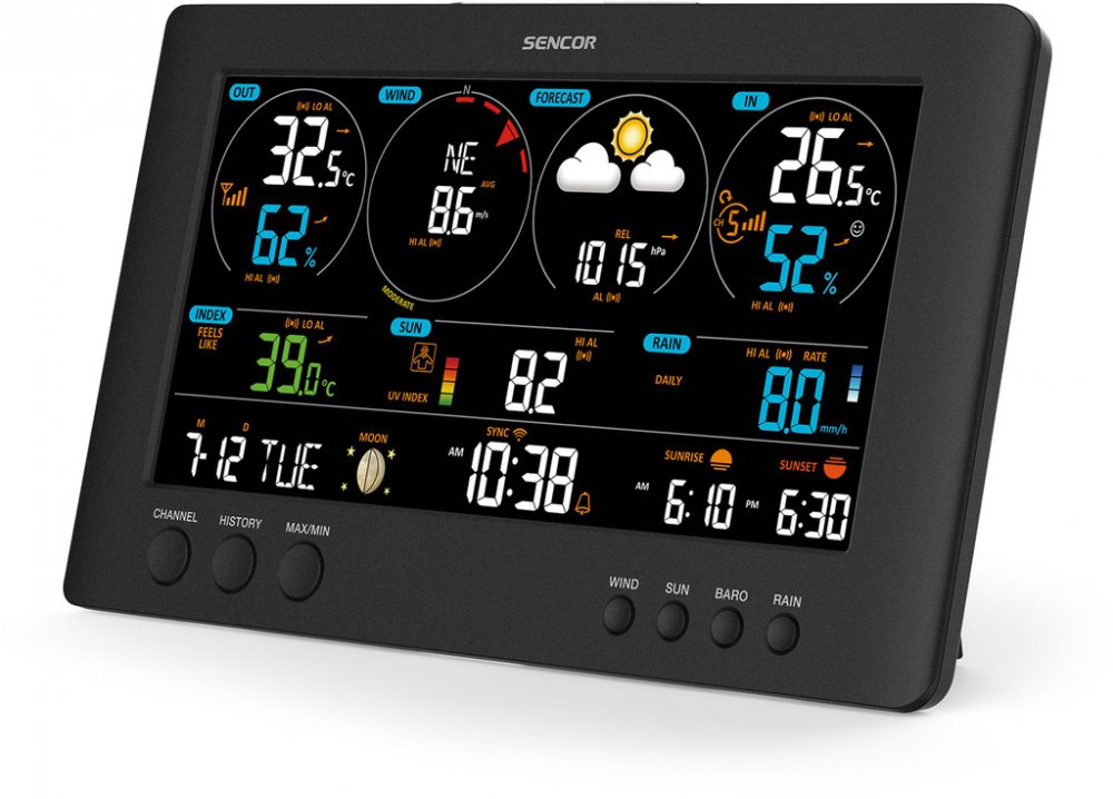Vynikající přístroj s perfektním přehledem o teplotě uvnitř i venku, který vás okamžitě informuje o všech podstatných parametrech souvisejících s počasím. Vaše domácí, a přece zcela profesionální meteorologická stanice 12500 WiFi vám kdykoli poskytne přesné údaje, takže budete vědět, jaká je aktuální vlhkost vzduchu, pocitová teplota, rosný bod, jak silný a rychlý je vítr, jaký je jeho směr, jaká je doporučená bezpečná doba pro opalování a dokonce i varování před náledím. Samozřejmostí je předpověď počasí na den dopředu, ale i další předpoklady a tendence, stejně jako statistické údaje o počasí v době minulé. Vysoce citlivé senzory zajistí i informace o srážkách, intenzitě světla a UV záření. Bonusem jsou funkce budíku, fází měsíce, kalendáře.
