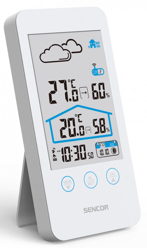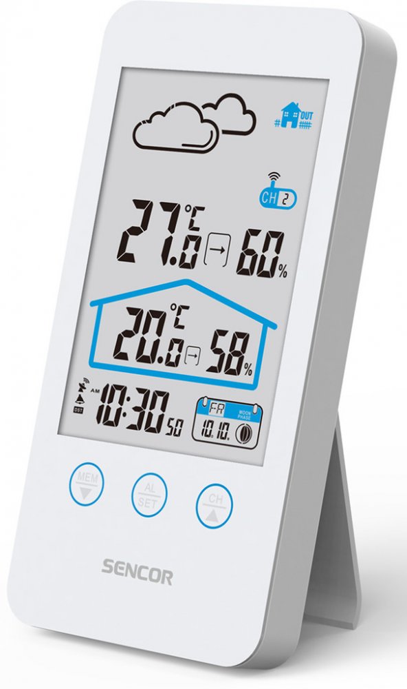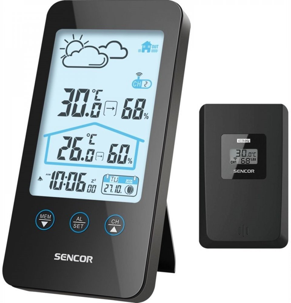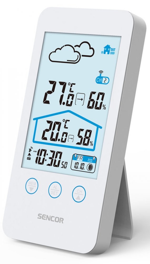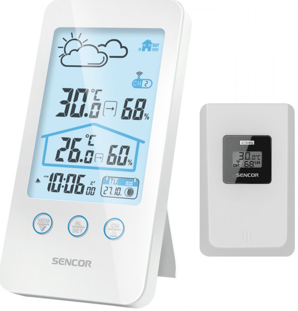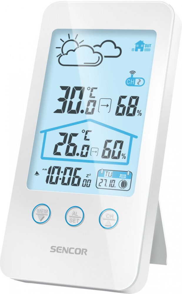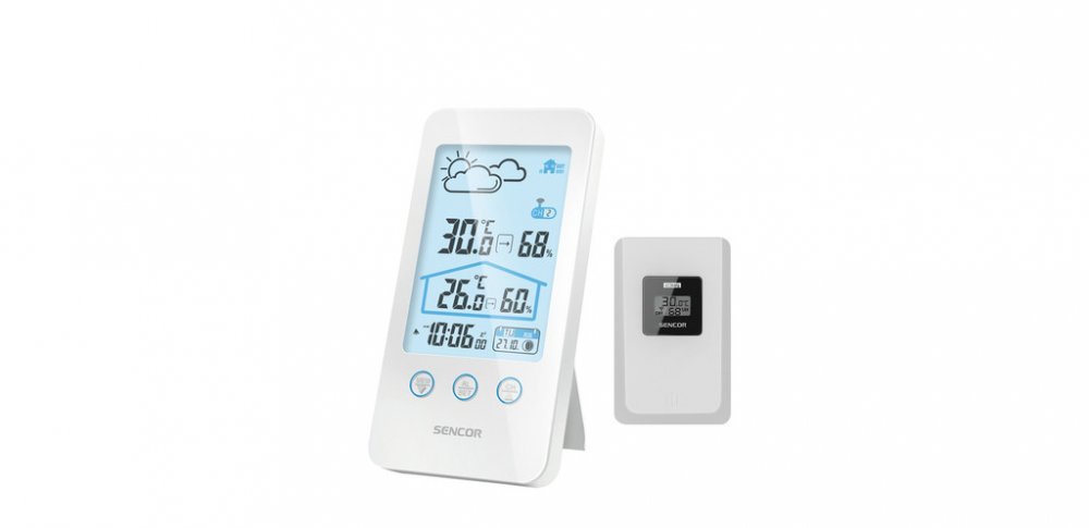 Sencor SWS 3000 W, Tato meteostanice meri vnitrni i venkovni teplotu a vlhkost. Na LCD displeji se zobrazuje cas, datum a den v tydnu a je mozne nastavit budik na opakovane buzeni. Na vyber mate z 12 nebo 24 hodinoveho casoveho formatu a ze °C nebo °F zobrazeni stupnice teploty. Maximalni a minimalni hodnoty jsou ulozene v pameti pristroje.