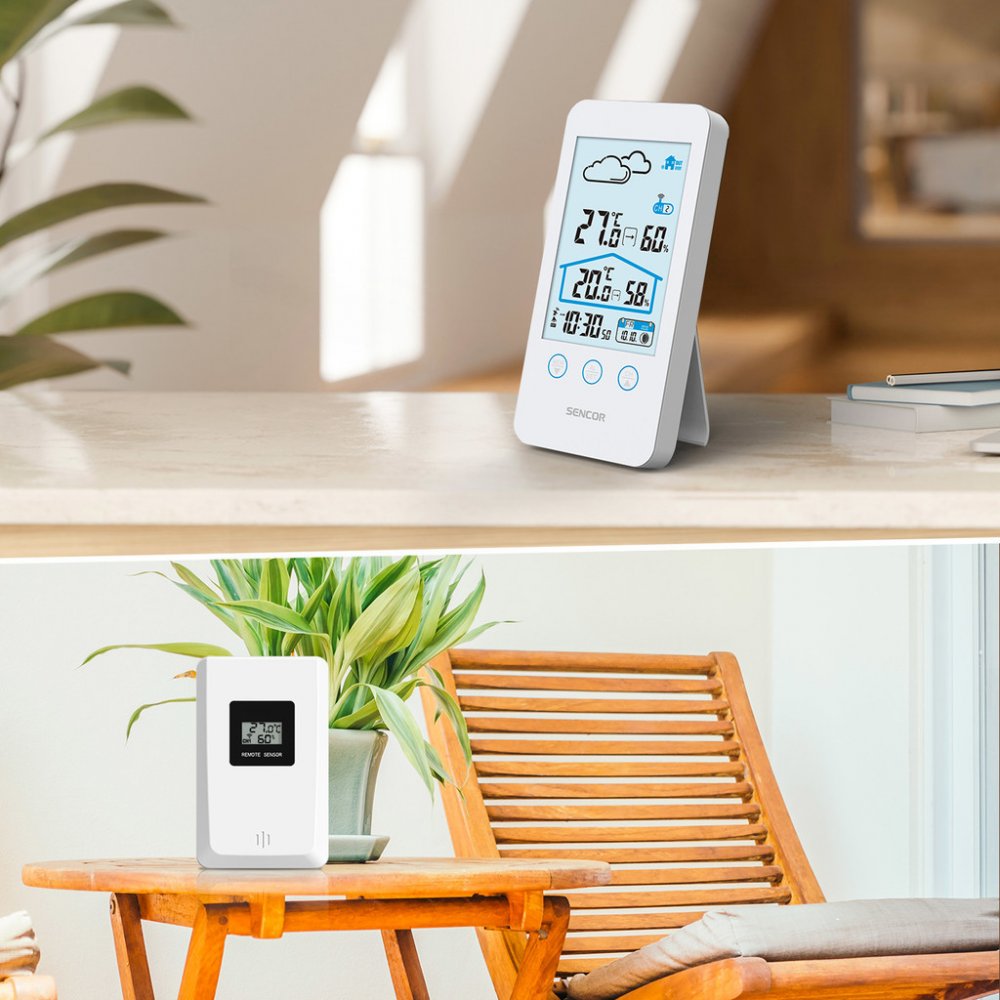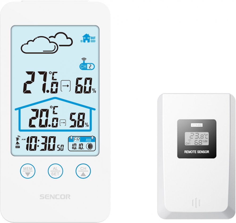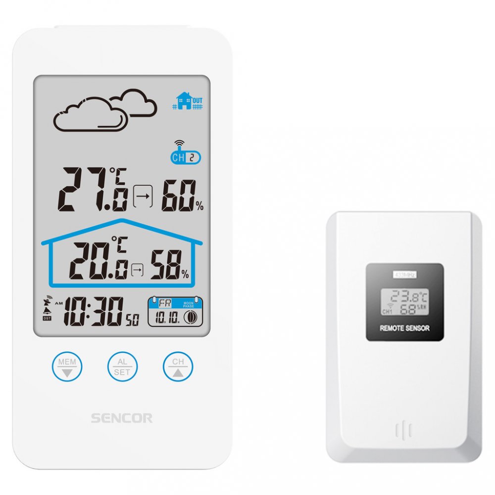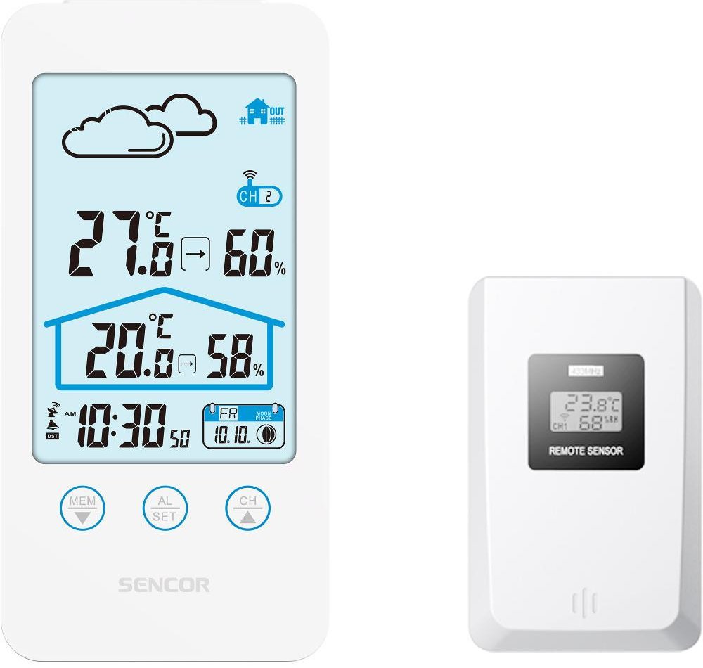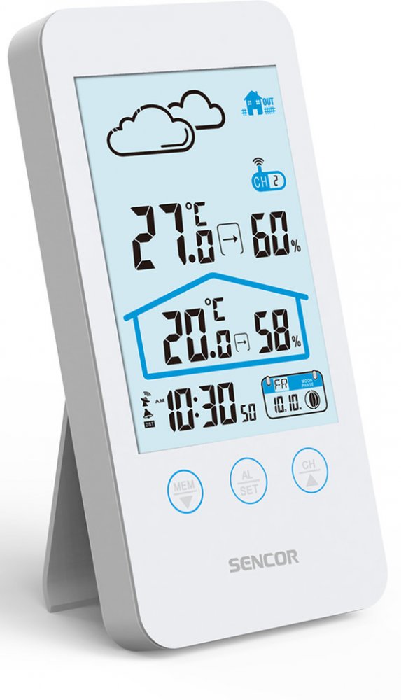 Sencor SWS 3000 W, Tato meteostanice meri vnitrni i venkovni teplotu a vlhkost. Na LCD displeji se zobrazuje cas, datum a den v tydnu a je mozne nastavit budik na opakovane buzeni. Na vyber mate z 12 nebo 24 hodinoveho casoveho formatu a ze °C nebo °F zobrazeni stupnice teploty. Maximalni a minimalni hodnoty jsou ulozene v pameti pristroje.
