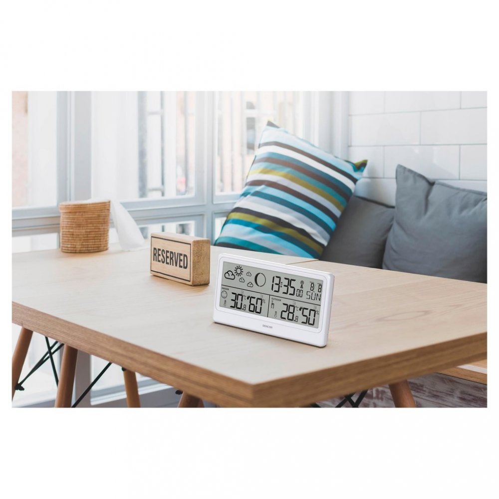 meteostanice, vnitřní i venkovní teplota a vlhkost, ikony předpovědi počasí na 12–24 hodin, ukladá min./max. záznamy do paměti, indikátor komfortu a vývoje, digitální čas, datum a den v týdnu, zobrazení měsíční fáze, funkce budíku