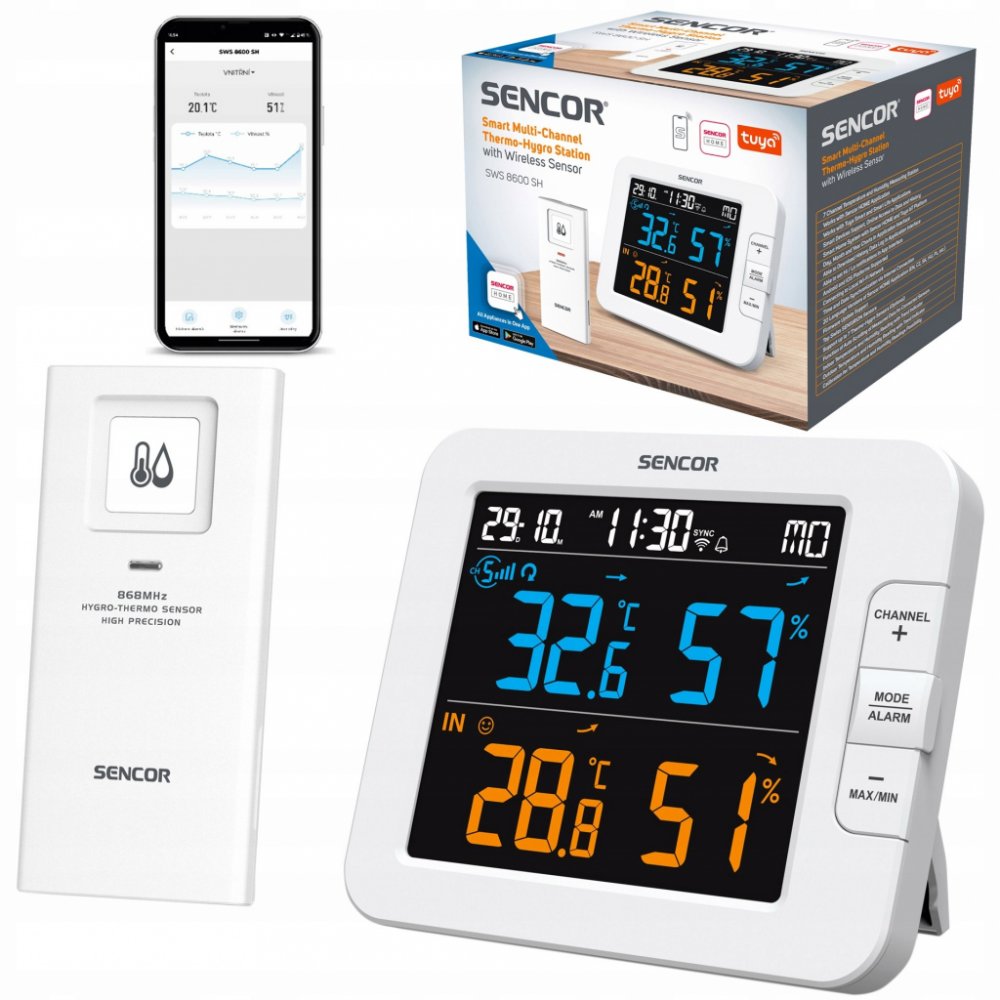 chytrá meteostanice, app. Sencor Home, Tuya Smart, Smart Live, měří teplotu, vlhkost, zobrazuje grafy dne, měsíce a roku v aplikaci, notifikace hodnot Hi/Lo, možnost připojení až 7 senzorů