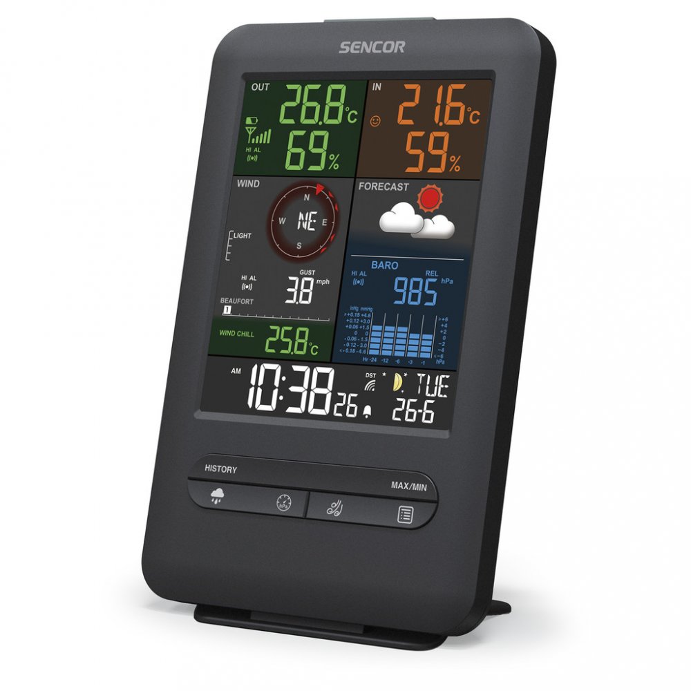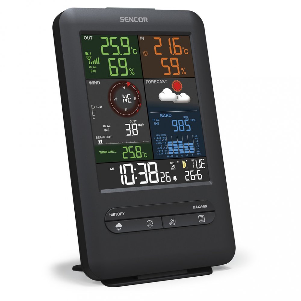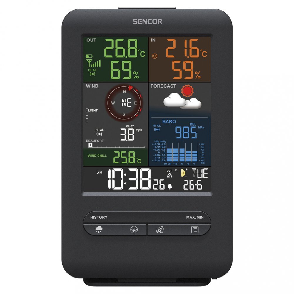 SENCOR SWS 9300 je komplexní meteostanice, která kombinuje měření teploty, vlhkosti, srážek, směru a rychlosti větru v jednom přenosném bezdrátovém senzoru. Barevný displej o úhlopříčce 5,4″ zobrazuje předpověď počasí, barometrické hodnoty, údaje z interiéru i exteriéru a mnoho dalších funkcí.