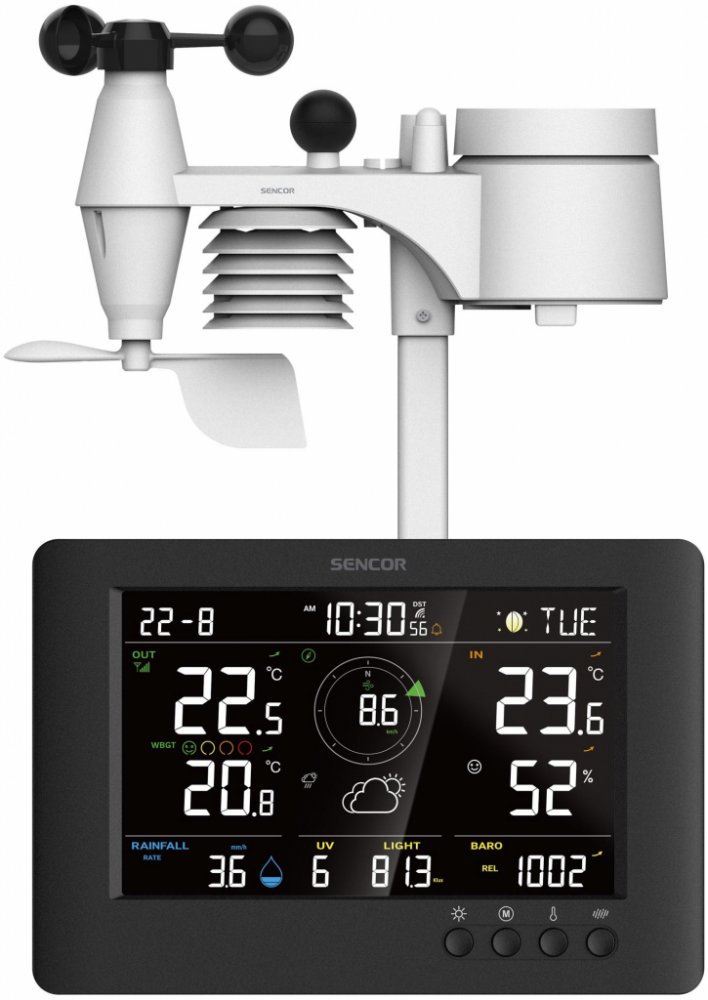 Snímač 8v1: Rychlost větru, směr větru, dešťové srážky, teplota, vlhkost, UV, intenzita světla a WBGT (součástí příslušenství)