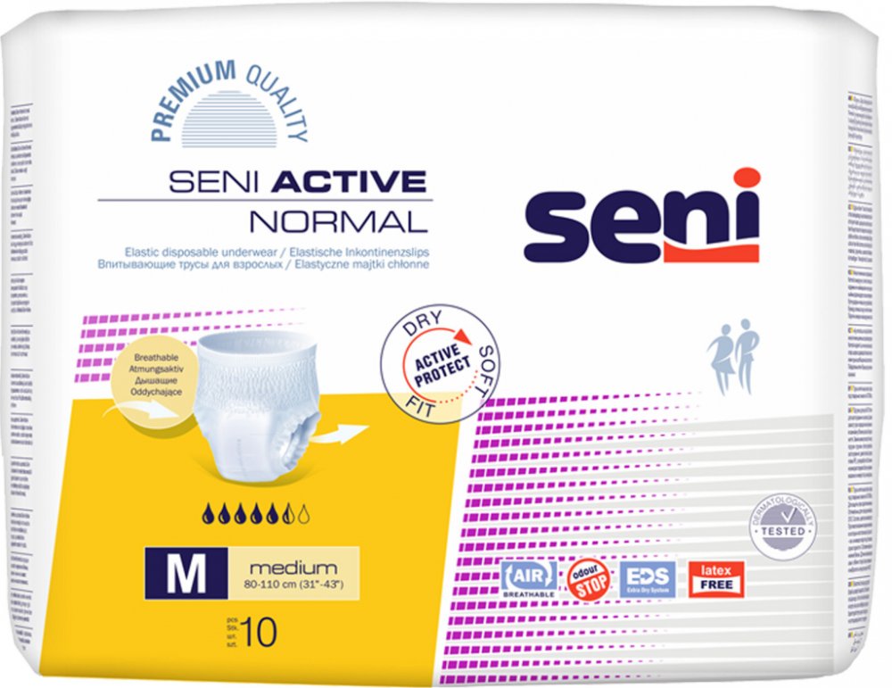 Seni Active Normal jsou savé kalhotky, které se nosí jako běžné spodní prádlo. Díky elastickému střihu a přizpůsobivému materiálu jsou neviditelné pod oblečením a umožňují volný pohyb bez omezení.