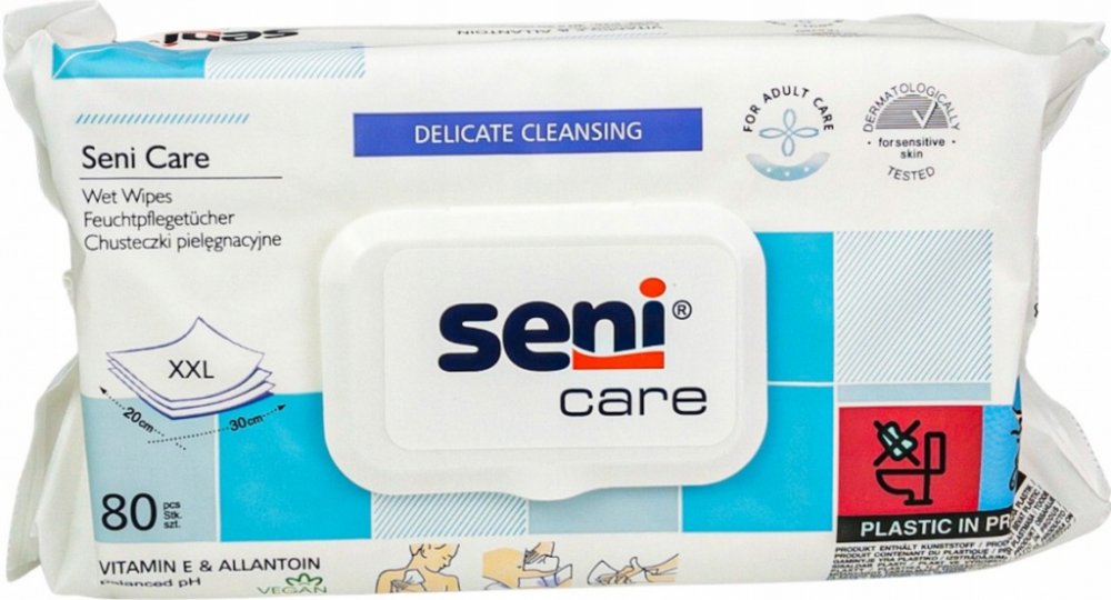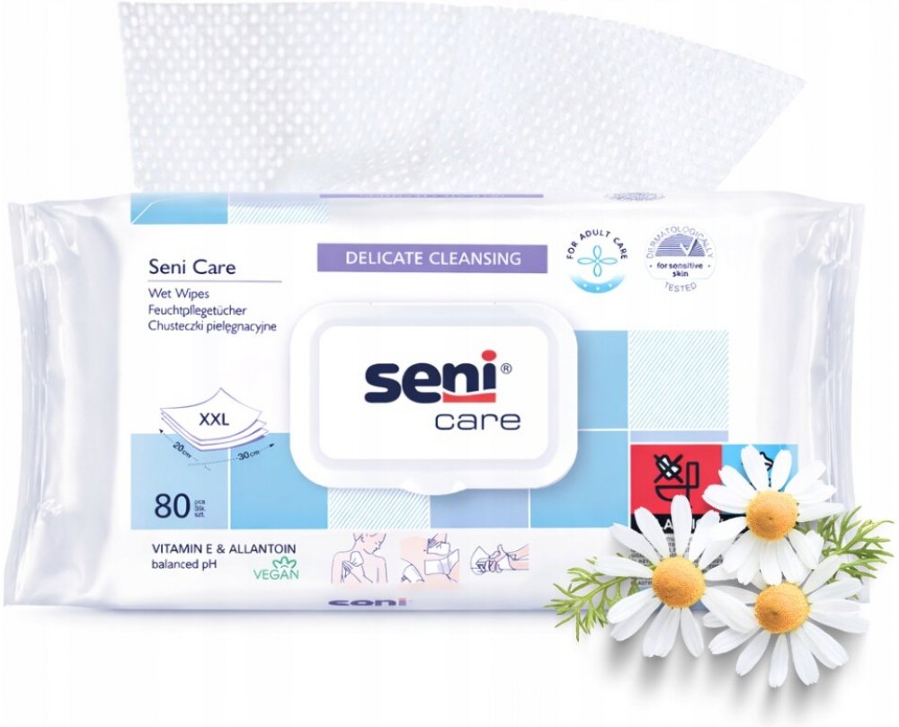 Vlhčené ošetřující ubrousky Seni Care umožňují snadno udržet hygienu po celý den, obzvláště u osob trpících úniky moči. Ošetřující vlhčené ubrousky Seni Care s pH 5,5 přátelským k pokožce, obohacené vitamínem E a alantoinem. Jemně čistí pokožku, zmírňují podráždění. Bez parabenů a alkoholu. S plastovým uzávěrem. Aktivní složky: Alantin, Vitamin E a Bisabolol. Balení obsahuje 80 ks v balení.