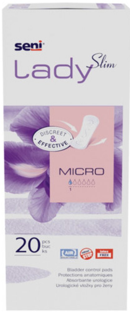Prodyšné anatomicky tvarované vložky Seni Lady Slim Micro jsou dámské inkontinenční vložky, které mají díky speciální struktuře mnohem vyšší savost než vložky menstruační. Obsahují superabsorbent, který váže zápach i tekutinu. Zajišťují tak ženě naprosté bezpečí při lehkém až středně silném úniku moči. Vložky mají vnitřní hydrofobní volánky, které zvyšují ochranu při větším úniku moči. Užijte si k...