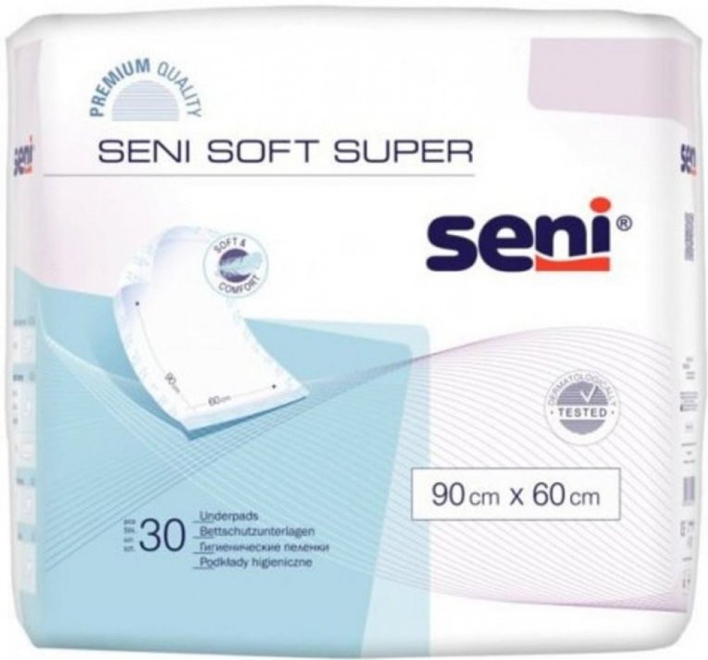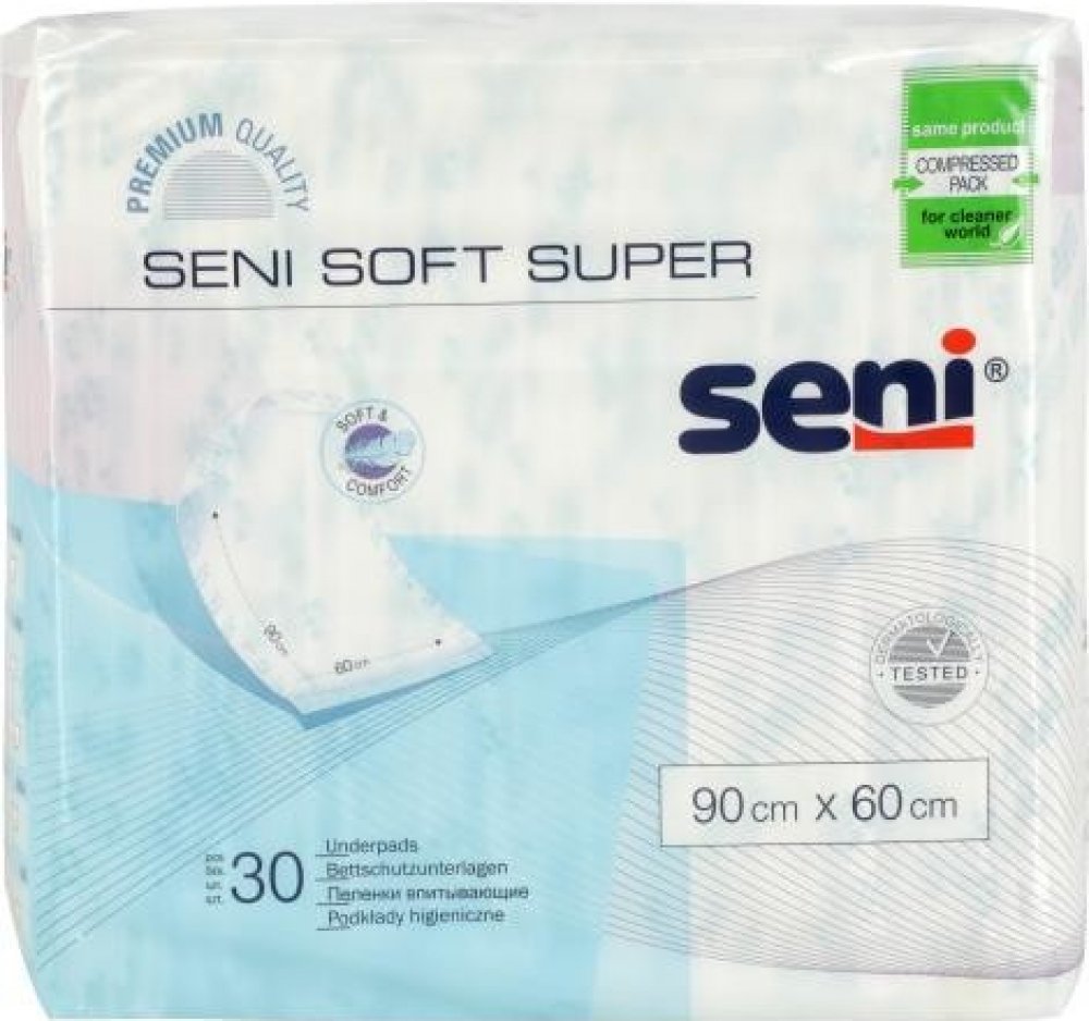 Hygienické podložky s absorpčním jádrem Seni Soft Super představují ideální doplňkovou ochranu postele a lůžkovin před namočením a při výměně plen.