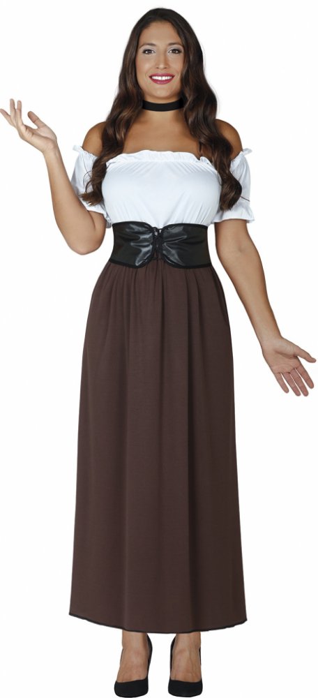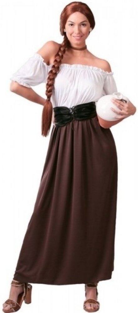 Kostým vesničanky, který se skládá z šatů a opasku, je jednoduchý, ale praktický a pohodlný. Šaty jsou vyrobeny ze 100% polyesteru a mají volné řezy, aby poskytovaly dostatek pohodlí pro denní práci. Vesnické šaty mají krátké rukávy a dlouhou sukni, která dosahuje téměř k zemi. Barvy šatů jsou jednoduché a přírodní, jsou hnědé a bílé. Opasek, který je na šatech slouží k upevnění šatů v pase. Celko...