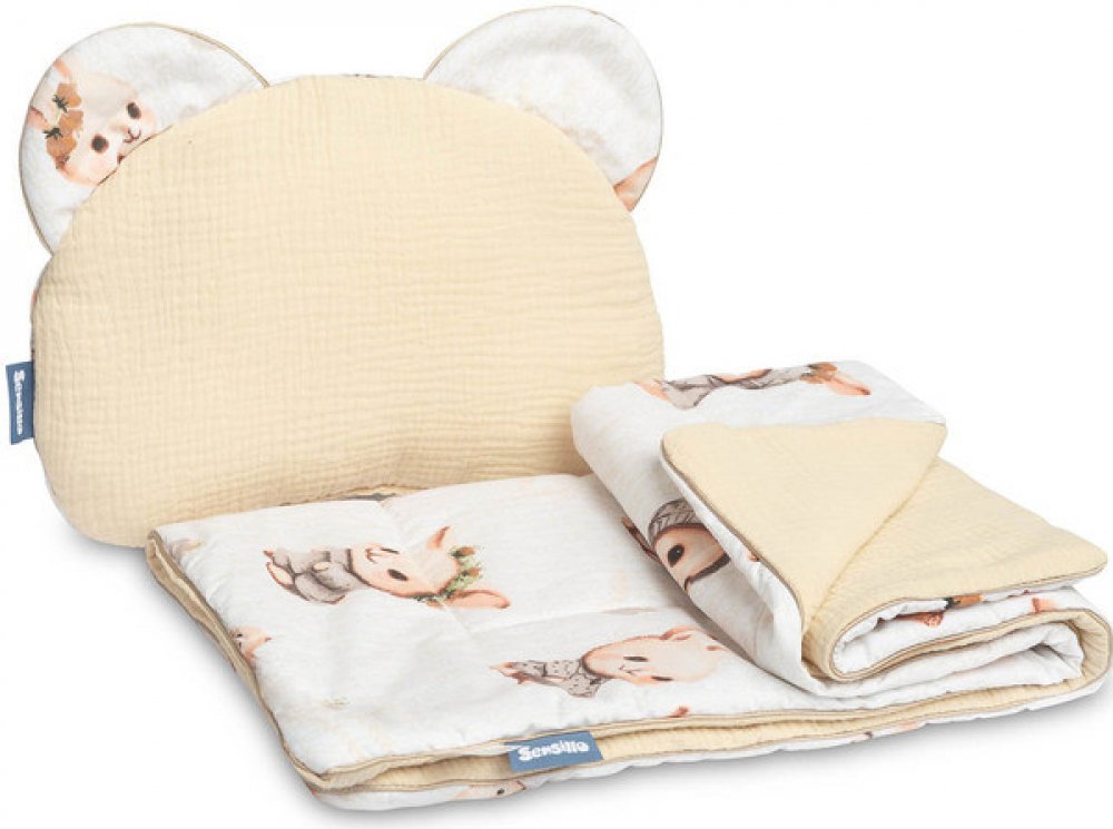 Sada obsahuje polštář a přikrývku z na dotek příjemného mušelínu a bavlny. Set se skvěle hodí do kočárku, postýlky nebo jako měkká podložka pro vaše miminko. Polštář samotný lze použít jako plyšovou hračku. Souprava je vyrobena ze dvou materiálů - vnitřek je 100% bavlna a vnější je jemný mušelín.