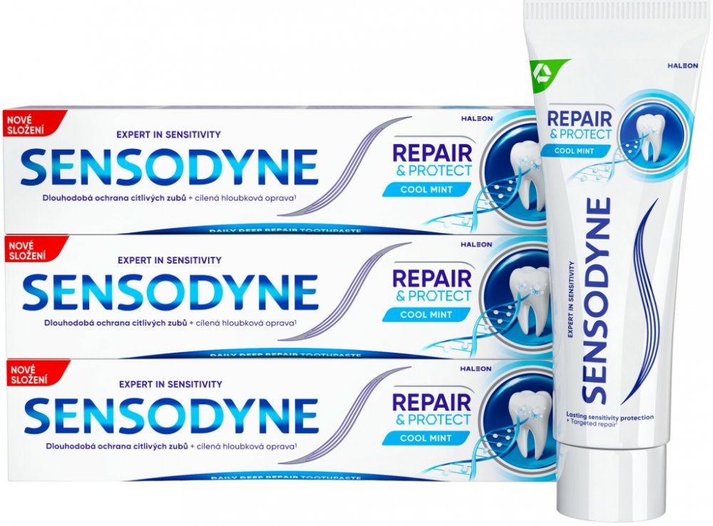 Sensodyne Repair & Protect Cool Mint, 3x75 ml, Zubní pasty unisex, Zubní pasta pro citlivé zuby Sensodyne Repair & Protect Cool Mint zaručí, že si budete vychutnávat studené či horké nápoje bez nepříjemných pocitů. Rozlučte se zvýšenou citlivostí zubů. Vlastnosti: snižuje citlivost zubů chrání před zubním kazem a plakem posiluje zuby udržuje svěží dech Jak používat: Používejte dle potřeby. Pro doč...