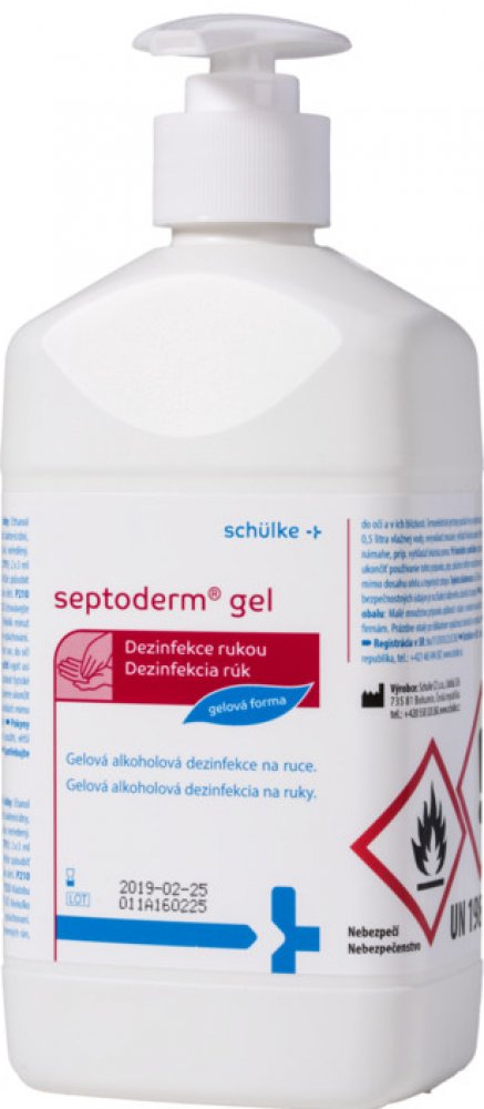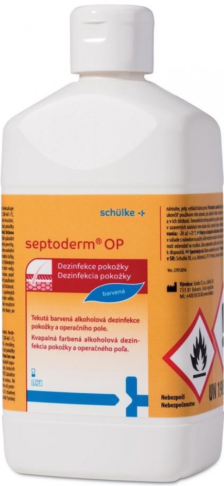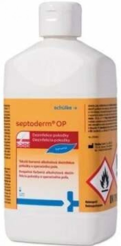 Barvená tekutá alkoholová dezinfekce pro operační pole Septoderm. Barvená tekutá alkoholová dezinfekce pro operační pole Septoderm. Vhodný pro dezinfekci pokožky před operačními zákroky, vpichy a malými zákroky porušujícími integritu kůže. Neobsahuje jód. Obsahuje barvivo k označní operačního pole. Dobrá snášenlivost s pokožkou. Rychlá a dlouhotrvající účinnost. Dezinfikuje, čistí a odmašťuje pokožku. Složení (účinné látky ve 100 g přípravku) – Ethanol 45 g, Propan-2-ol 30 g, KAS 0,5 g. Aplikace – Operační pole se důkladně potře tamponem namočeným v septodermu OP, přípravek se nechá působit do zaschnutí, zvláště před prací s termoelektrikými přístroji. Použití: Dezinfekce kůže před injekcemi a odběry 15 s. Dezinfekce kůže před punkcemi kloubů, dezinfekce operačního pole a postoperativní dezinfekce kůže 1 min. Dezinfekce kůže s vyšším výskytem mazových žláz 2 min. A – baktericidní Ι (B) – virucidní na BVDV / Vaccini, T– tuberkulocidní (M. terrae) Ι M – mykoaktericidní (M. avium, M. terrae) / (V) – levurocidní (C. albicans) / ROTA – Rotavirus Ι H – Herpesvirus.