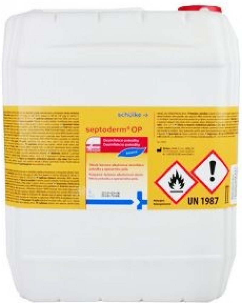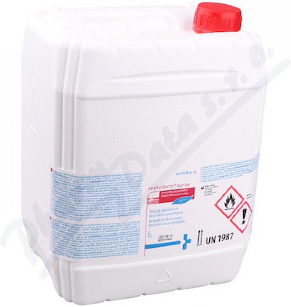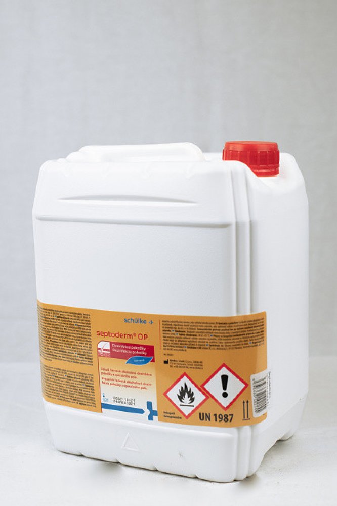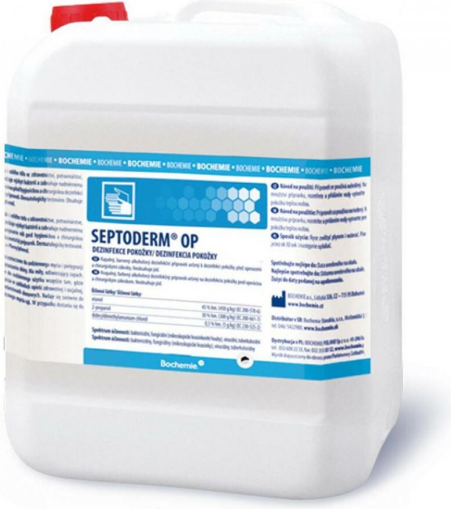 Barvená tekutá alkoholová dezinfekce pro operační pole Septoderm. Vhodný pro dezinfekci pokožky před operačními zákroky, vpichy a malými zákroky porušujícími integritu kůže. Neobsahuje jód. Obsahuje barvivo k označní operačního pole. Dobrá snášenlivost s pokožkou. Rychlá a dlouhotrvající účinnost. Dezinfikuje, čistí a odmašťuje pokožku. Složení (účinné látky ve 100 g přípravku) - Ethanol 45 g, Propan-2-ol 30 g, KAS 0,5 g. Použití: Dezinfekce kůže před injekcemi a odběry 15 s. Dezinfekce kůže před punkcemi kloubů, dezinfekce operačního pole a postoperativní dezinfekce kůže 1 min. Dezinfekce kůže s vyšším výskytem mazových žláz 2 min. A - baktericidní ? (B) - virucidní na BVDV / Vaccini, T- tuberkulocidní (M. terrae) ? M - mykoaktericidní (M. avium, M. terrae) / (V) - levurocidní (C. albicans) / ROTA - Rotavirus ? H - Herpesvirus.