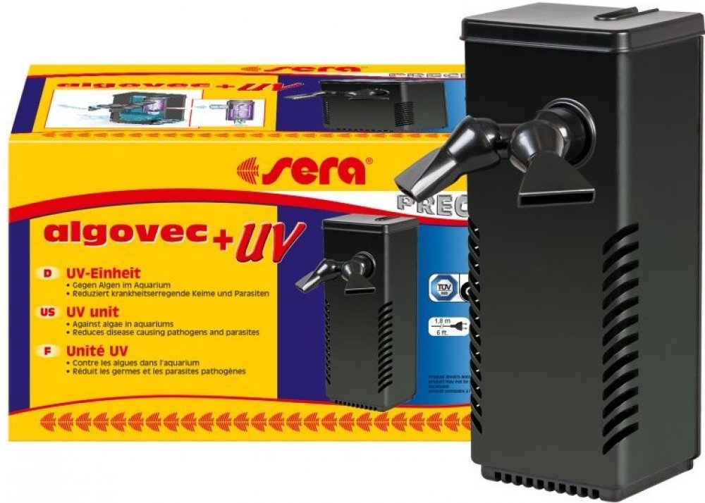 Sera algovec UV je inovativní UV-C-jednotka, která snižuje fyzikálním způsobem růst řas, zárodky a parazity a lze ji použít jako doplněk k existujícímu biofiltru. Integrované čerpadlo nasává vodu bočními štěrbinami tak, aby byla uvnitř čištěna UV-C zářením a to zcela bez chemikálií. Dodané čerpadlo FP 350 (max. 350 l/h, 6 W) je obzvlášť energeticky úsporné a výkon může být individuálně nastaven. Y-rozdělovač umožňuje variabilní nastavení směru proudění. Dodávané přísavky umožňují snadné uchycení sera algovec UV (kolmo nebo vodorovně) na stěnu akvária. Sera algovec UV systém je vhodný pro akvária do 100 l. Obsahuje Sera filtrační a napájecí čerpadlo FP 350, Sera UV-C systém 5 W včetně transformátoru a předřadiče, nastavitelný Y-rozdělovač.