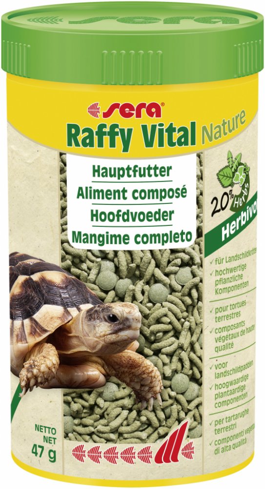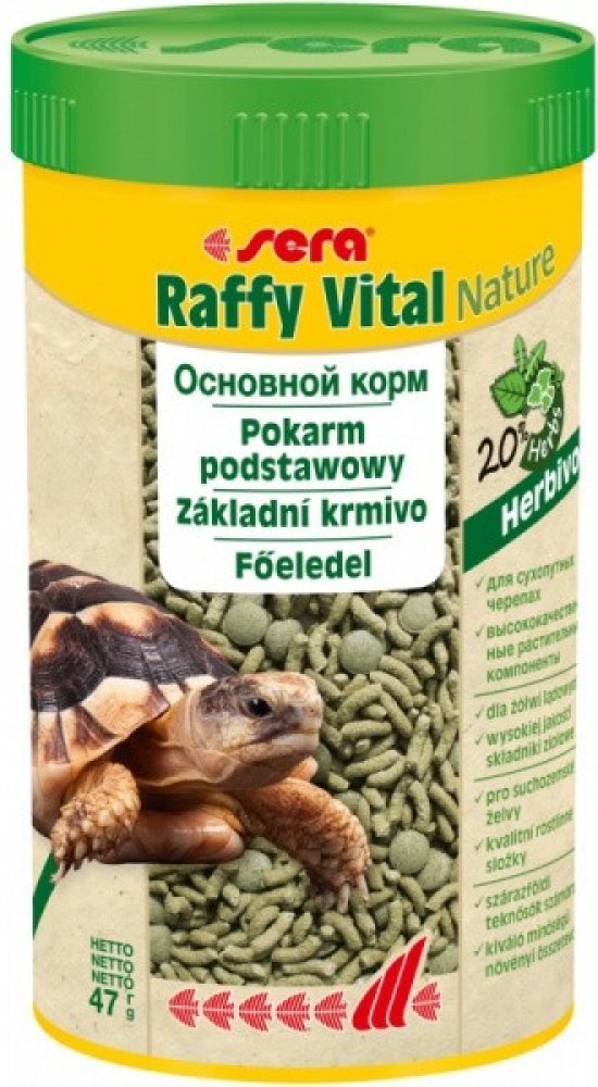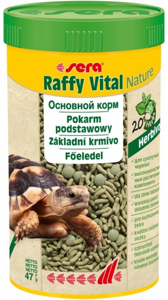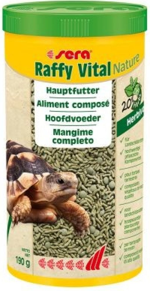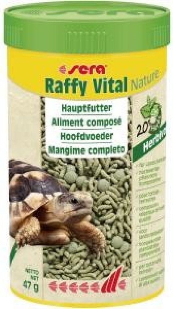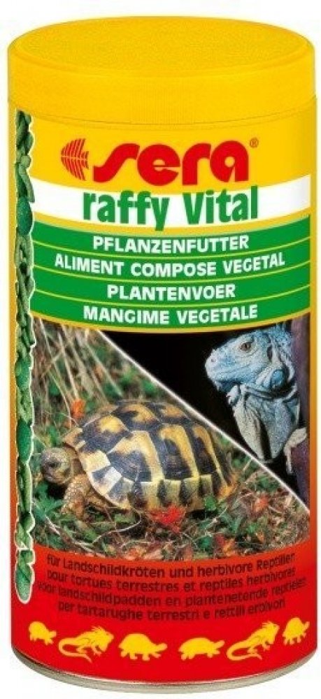 Sera Raffy Vital je základní krmivo pro suchozemské želvy a ostatní býložravé plazy. Chutná směs krmných granulek tyčkovitého tvaru a krmných tablet. Tato strava je bohatá na balastní látky. Krmivo obsahuje malé množství rybích proteinů pro vyváženou potravu a posílení přirozené imunity. Pečlivě vyvážené přidávané vitaminy a minerální látky spolehlivě brání změknutí krunýřů a kostí (rachitida). Neobsahuje žádná umělá barviva ani umělé příchutě.