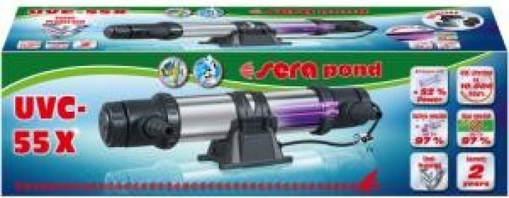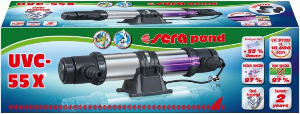 Se sera Pond UVC-55X získáte dlouhodobě průzračnou a biologicky zdravou jezírkovou vodu. Spolehlivě odstraňuje všechny druhy plovoucích řas (zakalená, zelená voda), snižuje rozmnožování vláknitých a dalších řas a odstraňuje dlouhodobě patogeny a bakteriální zákal vody až do 97%.UVC korozi odolné nerezové pouzdro má nejen dlouhou životnost, nýbrž odráží záření a zesiluje jeho účinek až o 35%. UVC lampa s amalgamem má až o 42% prodlouženou životnost a vyšší výkon (více než 52%) než standardní UVC lampy.Zařízení lze namontovat na filtry nebo předfiltrační komoru pomocí dodaného průchozího konektoru a je také vhodné pro přímé napojení na jezírkové čerpadlo (90° vtokový konektor pro 25 a 32 mm hadice jakož i vario konektor na hadice pro 20, 25, 32 a 40 mm, rovněž dodaného).UVC systém sera Pond UVC-55X je dodáván s 10 m kabelem.