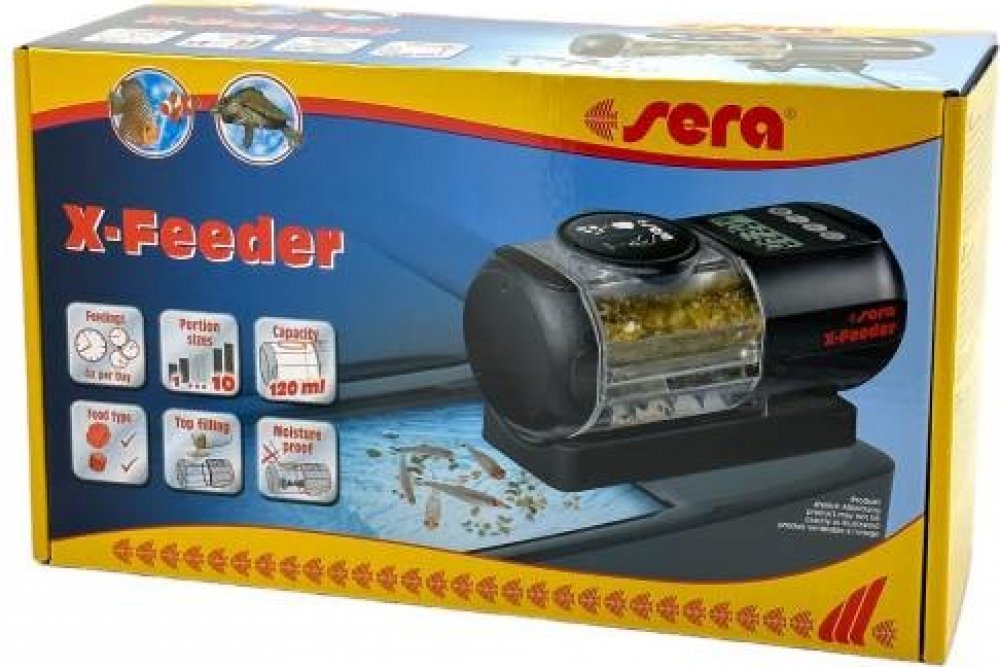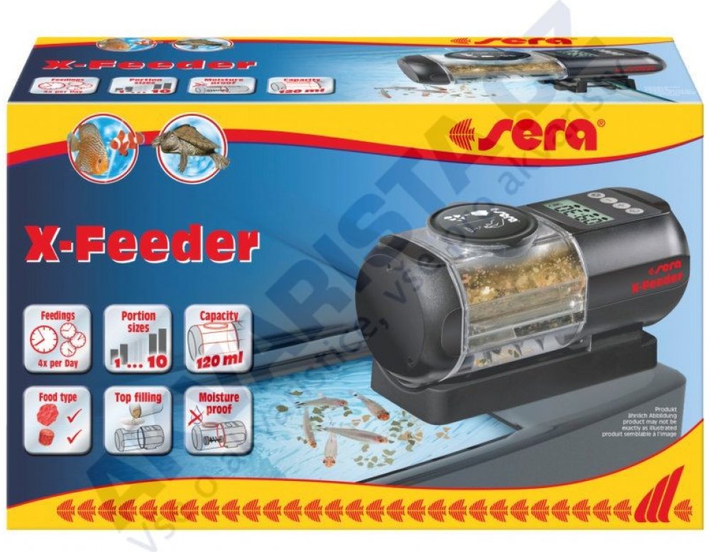 Se Sera X-Feeder lze nastavit 4 časy na krmení za den. Množství krmiva na jedno krmení lze individuálně nastavit v deseti krocích. Navíc manuální krmení lze nastavit kdykoliv.
