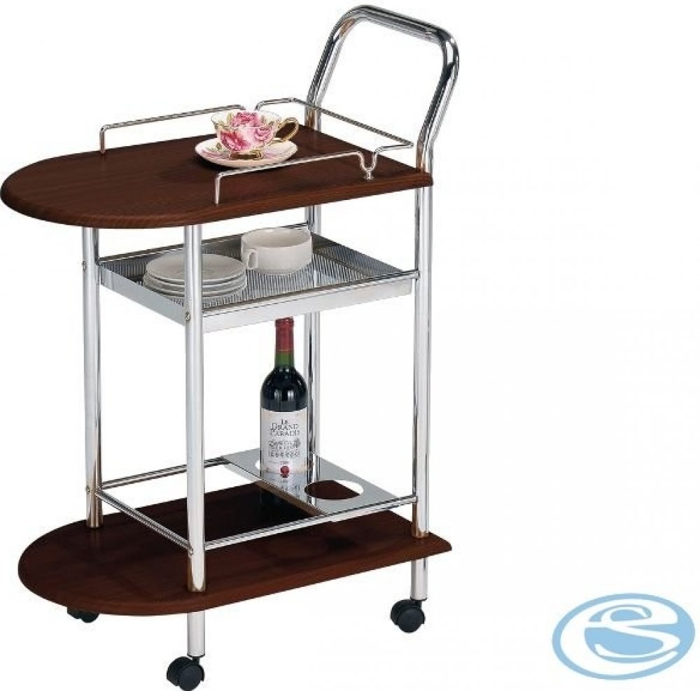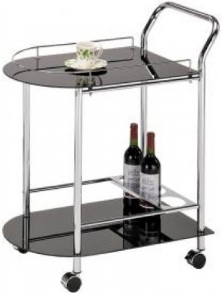 Jednoduchá manipulace díky kolečkám. Kovová konstrukce je pochromovaná, vrchní a spodní deska je z MDF v barvě wenge. Ve spodní části jsou praktické úchyty na láhve.