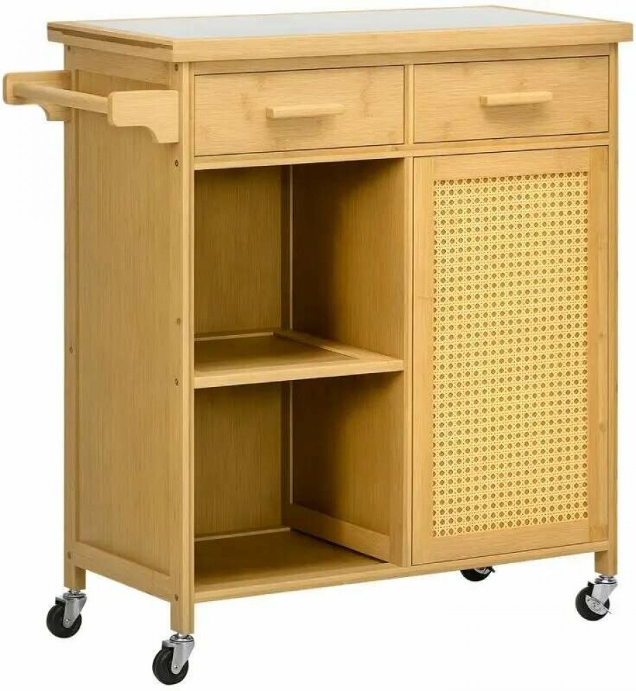 Tento praktický kuchyňský vozík s bambusovým vzhledem promění každodenní organizaci ve stylový zážitek. Je vybaven dvěma prostornými zásuvkami, praktickou skříňkou a otevřenými policemi, které poskytují dostatek prostoru pro kuchyňské potřeby, nádobí či dekorace.