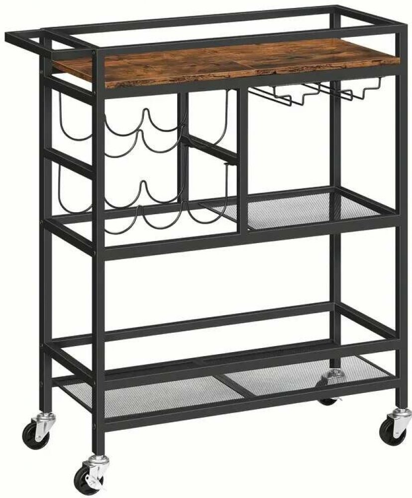 Vozík nabízí tři úrovně úložného prostoru, ideální pro sklenice, lahve, servírovací potřeby nebo dekorace. Díky integrovaným držákům na sklenice a víno budete mít vše přehledně uspořádané a vždy po ruce. Kolečka s plynulým chodem zajišťují snadné přemisťování a boční úchyty usnadňují manipulaci.