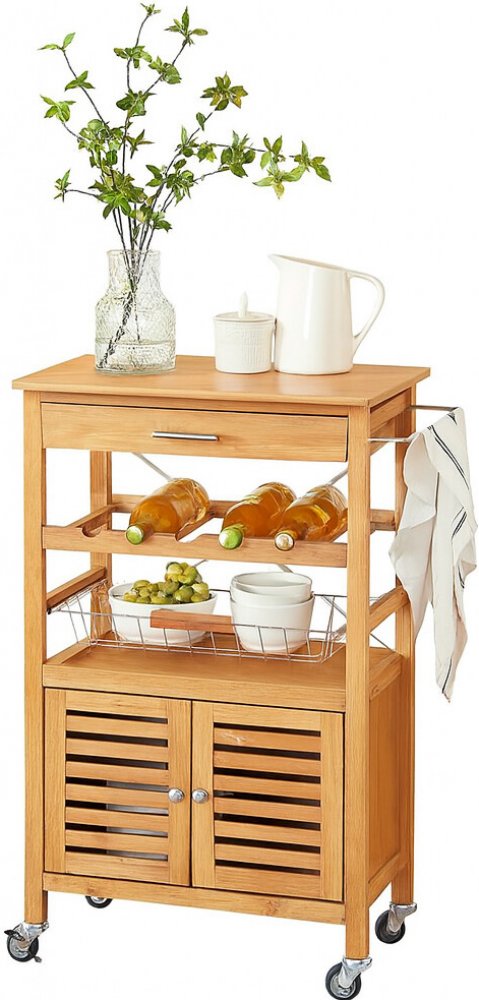 Hladce pojízdná kolečka umožňují snadné přemísťování, ať už jej využijete jako servírovací stolek, úložný organizér nebo pomocníka při vaření. Bambusový materiál je odolný vůči vlhkosti a přináší přírodní estetiku, která se hodí do moderních, rustikálních i skandinávských interiérů.