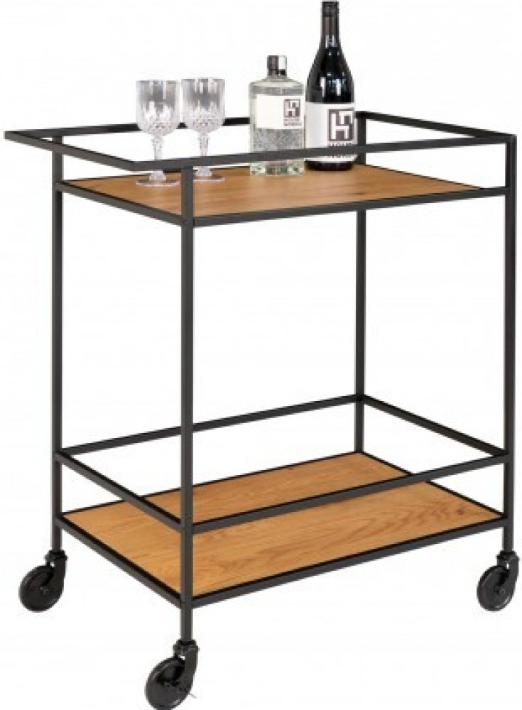 Barový pojízdný stolek VITA House Nordic, dubový a černý kov z dřevotřískové desky dubového vzhledu je novinkou na trhu designu. Pojízdný stolek na kolečkách VITA House Nordic má dvě odkládací police a velmi snadno se udržuje a nezabírá skoro žádné místo. Využití najde v obývacím pokoji, v ložnici nebo v pracovně.