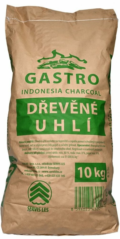 Dřevěné gastro uhlí 10 kg z Indonésie z velmi tvrdých tropických dřevin. Dřevěné uhlí určené pro profesionály – restaurace, grill-bary, rychlé občerstvení, přípravu trdelníku, kebabu apod. Import z Indonésie. Pevný a nepropustný pytel. Vhodné i pro kvalitní domácí grilování. Vzhledem k velikosti je toto dřevěné uhlí méně vhodné pro použití v malých zahradních grilech (při použítí nutno rozlomit vě...