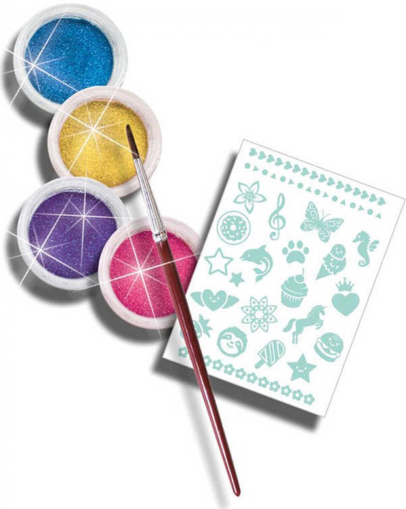 Vytvořte si vlastní módní tetování se třpytkami! Vyberte šablonu, přiložte na kůži, odstraňte ochrannou vrstvu, štětcem naneste třpytky a vaše originální tetování je hotovo. Pokud se vám již tetování nelíbí, jednoduše ho sloupejte a vytvořte si nové dílo. Tyto výrobky jsou bezpečné, kosmeticky testované, omyvatelné a vysoce kvalitní.