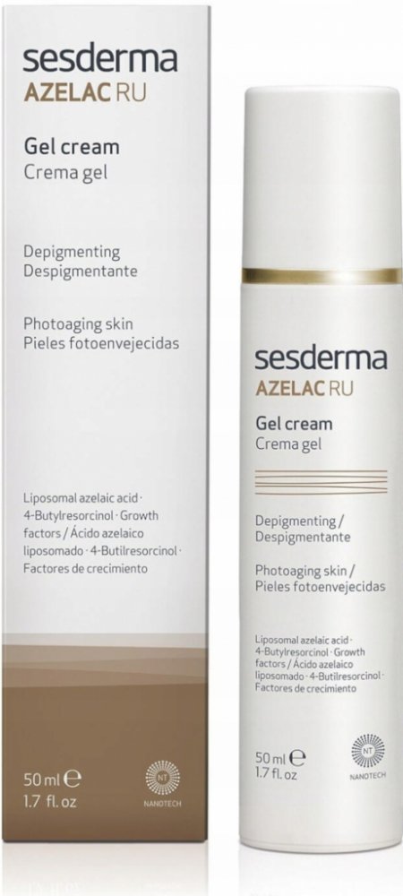 Azelac RU Krém-gel obsahuje látky zesvětlující pigmentové skvrny, jako je kyselina azelaová, 4-butylrezorcinol a nejnovější objevy růstových faktorů rostlinného původu, které nejen redukují příznaky fotostárnutí pokožky, ale také vrásky. Azelac RU krém-gel je opravdovou inovací – produkt má vlastnosti i protistárnoucí účinky. Je ideálním řešením pro osoby, které se potýkají s problémem pigmentových skvrn, melazmy, vyvolaným vystavením slunci, těhotenstvím, stárnutím, hormonální léčbou nebo pihami. Může být používán jako doplněk k jiným depigmentačním kúrám (chemické peelingy, laserové ošetření). Receptura Azelac RU Krem-gel je založena na nanotechnologii, tedy transportu aktivních složek uzavřených v lipozomech do hlubších vrstev pokožky a zvyšuje tak vlastnosti přípravku. Kyselina azelaová potlačuje tyrosinázu, má protizánětlivé a antioxidační účinky, nikotinamid snižuje zarudnutí, má zklidňující a antibakteriální účinky. Přídavek retinolu pomáhá zesvětlit pigmentové skvrny. Růstové faktory zvyšují úroveň migrace keranocytů, množení fibroblastů a opravu a obnovu pokožky, regulují činnost barvivových buněk, čímž sjednocují tón pleti, snižují oxidaci buněk a zastavují fotostárnutí. Azelac RU krém-gel je velmi dobře snášen pokožkou.