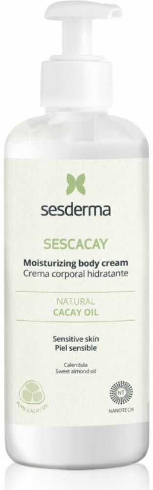 Sesderma SESCACAY Moisturizing Body Cream, 250 ml, Tělové krémy pro ženy, Tělový krém Sesderma SESCACAY pečuje o vaši pokožku a dodává jí potřebnou výživu a dlouhodobou hydrataci. Vlastnosti: hloubkově hydratuje pokožku zklidňuje pokožku a osvěžuje ji zlepšuje pružnost pokožky a její elasticitu intenzivně vyživuje a zvláčňuje Složení: mandlový olej – vyživuje, pomáhá uzamykat v kůži vlhkost a udržovat ji tak hydratovanou, zjemňuje hrubou texturu a kožní nerovnosti, pomáhá předcházet tvorbě suchých šupinek i podráždění Jak používat: Naneste přípravek na čistou pokožku a jemně vmasírujte do úplného vstřebání.