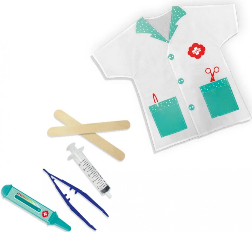 Součástí balení je lékařský plášť, teploměr, stříkačka, pinzeta a 2 dřívka, díky kterým si děti mohou hrát na vyšetřování, ošetřování i péči o nemocné . Hra přirozeně rozvíjí fantazii, empatii, komunikační dovednosti i jemnou motoriku a pomáhá dětem zbavit se strachu z návštěvy lékaře.