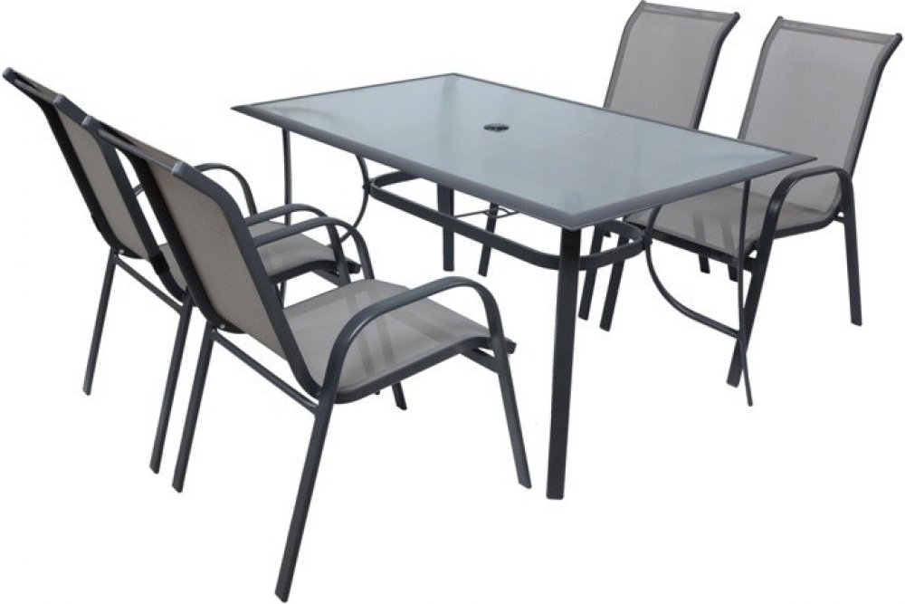 Kombinovaný set čtyř židlí a stolu z hliníkových profilů a komaxitovou povrchovou úpravou. Stůl s tvrzeným sklem. Vhodné pro použití v interiéru, exteriéru i ve vlhkém prostředí.