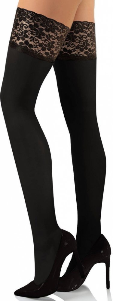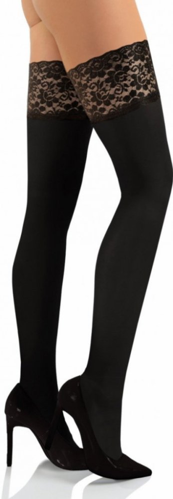 Samodržící punčochy, které jsou vyrobené z mikrovlákna. Punčochy jsou hladké, matné a ozdobené krajkou podloženou silikonem.Jemnost: 50 DEN