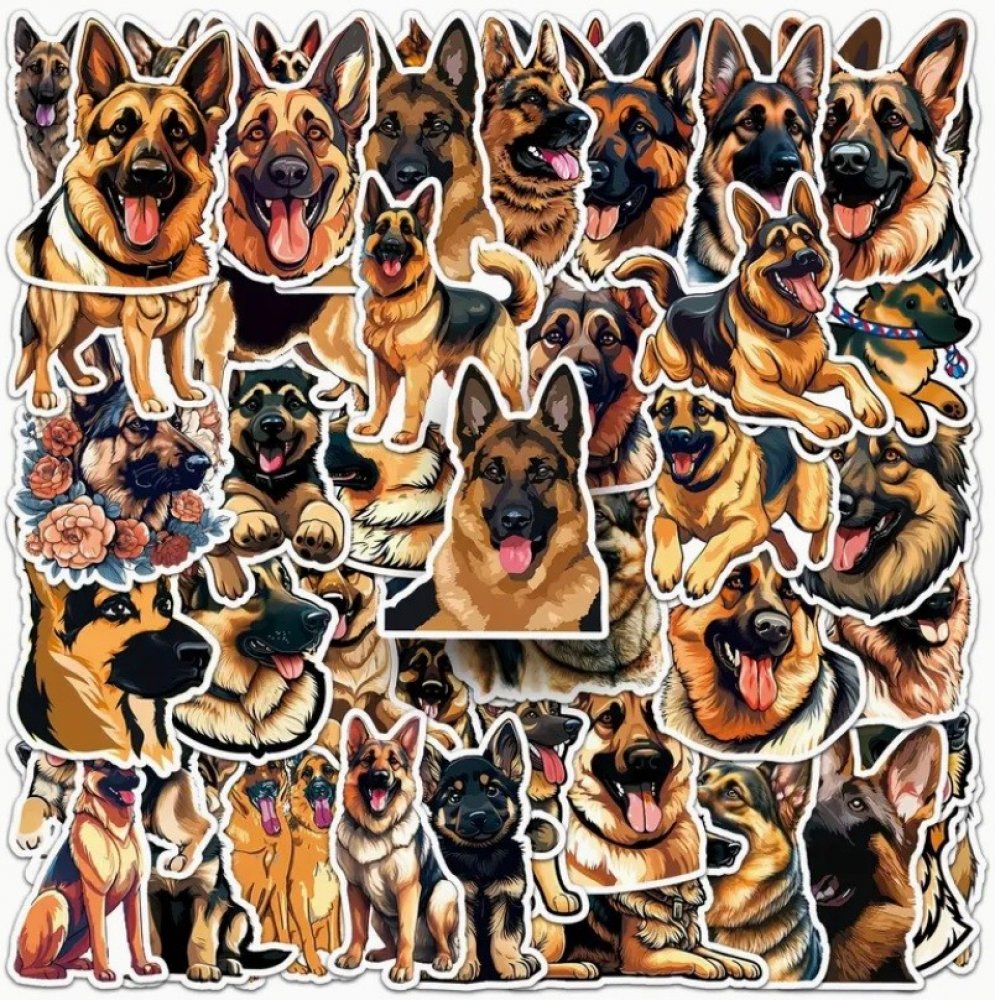 Set 50 barevných samolepek s německým ovčákem. Každá samolepka německého ovčáka je jiná, najdete na nich veselé i hravé německého ovčáky, některé s vyplazeným jazykem. Německý ovčák patří mezi oblíbená psí plemena, je to skvělý parťák a věrný kamarád.