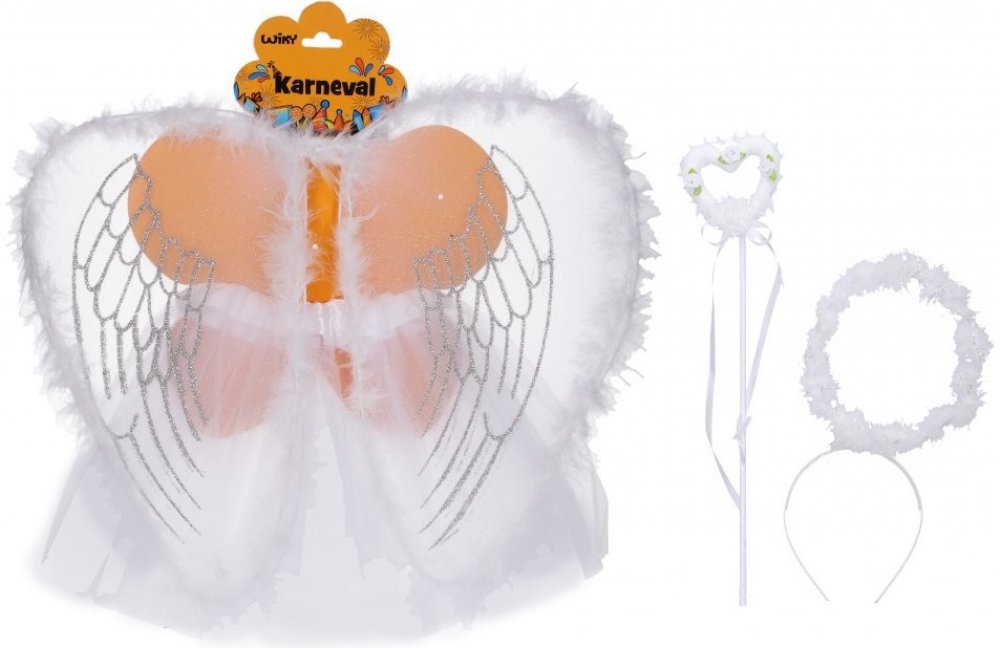 Karnevalový set - anděl Obsahuje: sukně, křídla, čelenka, hůlka Délka sukně: 30 cm