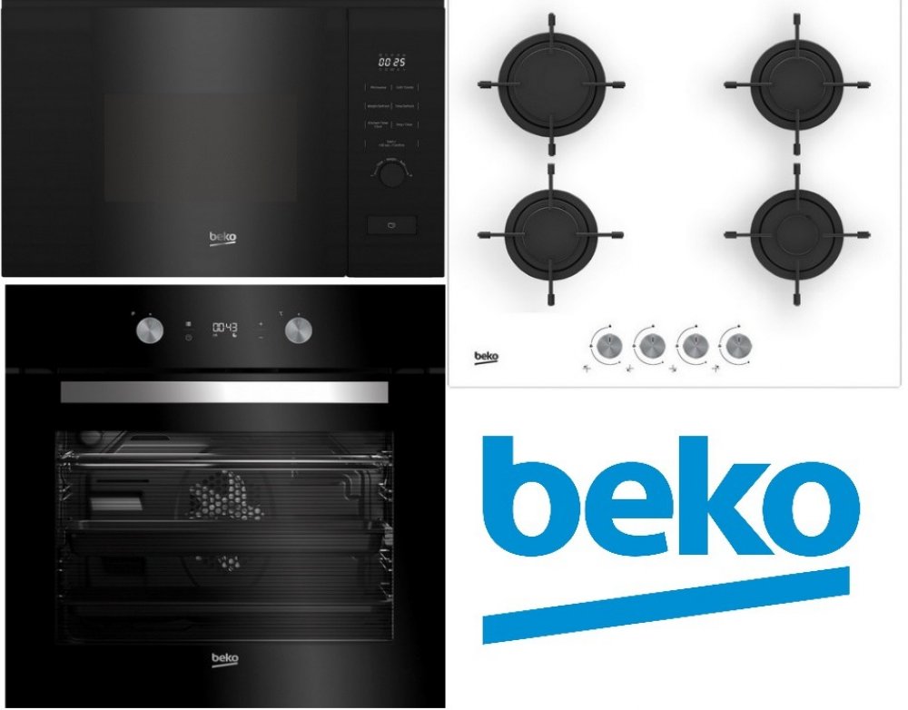 Multifunkční trouba BIM24300BS, 8 programů, 3 skla, Celoskleněné vnitřní dveře, Soft Close, dotekové ovládání, nastavitelný jas, zátlačné černé ovládací knoflíky, 1 teleskopický výsuv, Plynová varná deska HILG64220SW, bílé sklo, 4 plynové hořáky, Integrované zapalování, Bezpečnostní pojistka zhasnutí plamene a Vestavná mikrovlnka Beko Beyond BMGB20212B, Objem: 20 litrů, Gril, Počet automatických p...