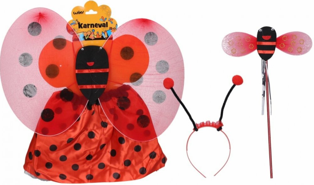 Set karneval beruška. Obsahuje křídla, sukýnku, čelenku s tykadly, kouzelnou hůlku.